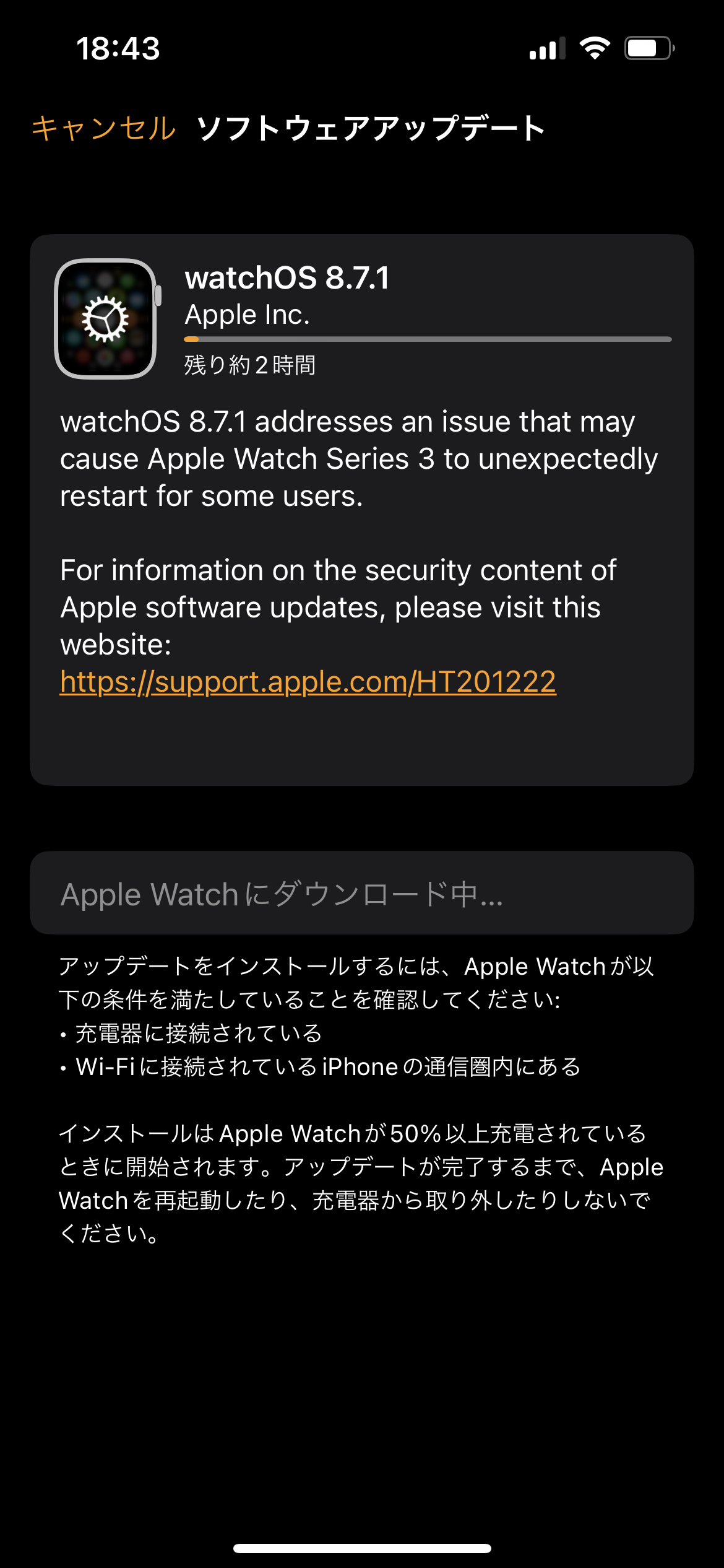 少し様子を見ていると何分かおきにAppleWatchが勝手に再起動のようなAppleマークになり、その度にiPhoneの残り時間の表示がリセットされまたアップデートの"残り時間2時間"、進捗を示すオレンジの棒もやり直しになってしまいます。