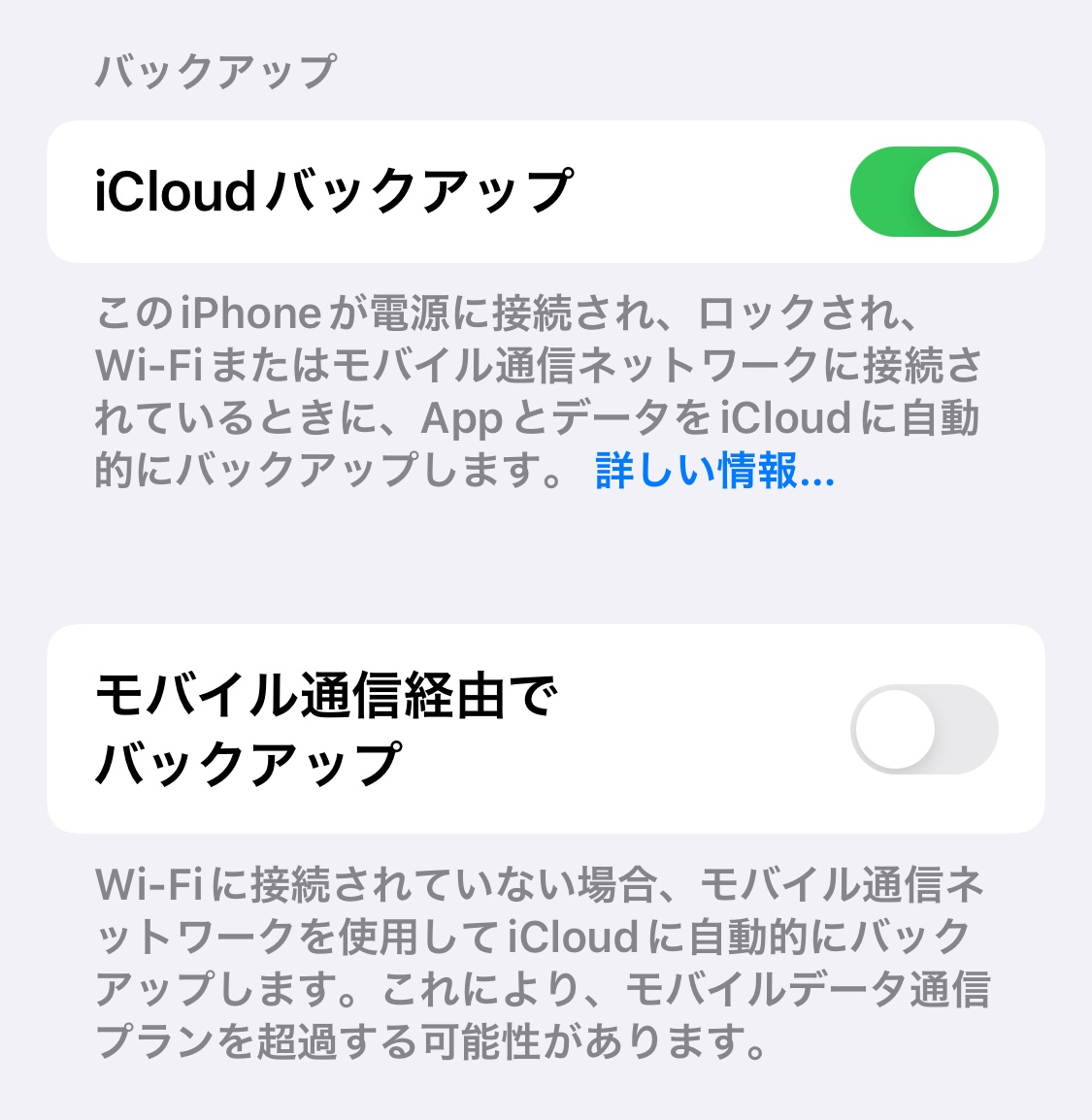 モバイルデータ通信の場合、iCloudバックアップをオフにする方法を教えてください。