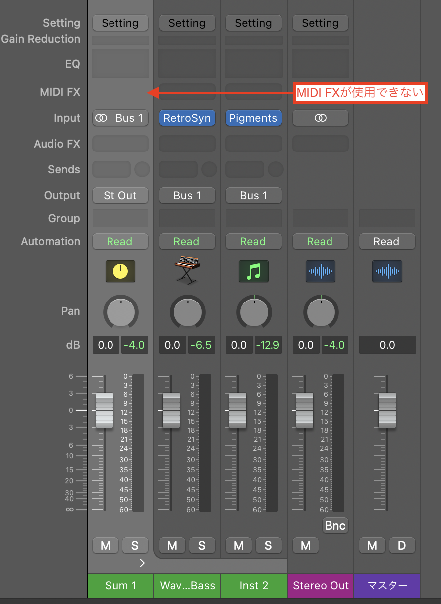画像:サミングスタックでは以下のようにMIDI FX欄はブランクになり、複数トラックに使えません。