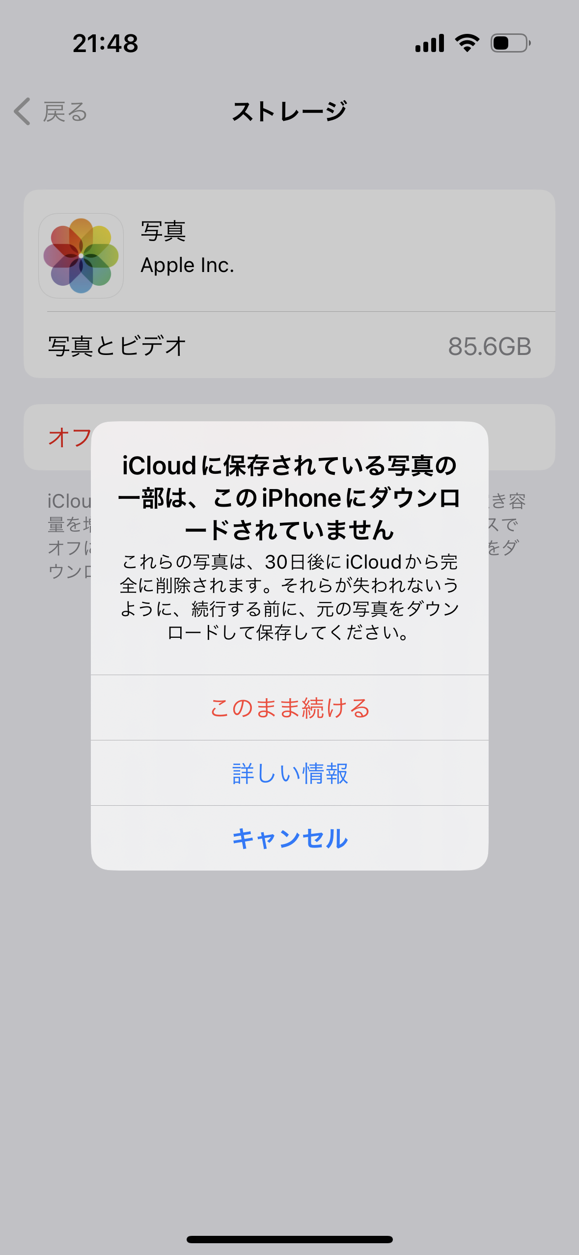 iCloud から写真を削除しようとしたところダウンロードが完了していないエラーが出ました