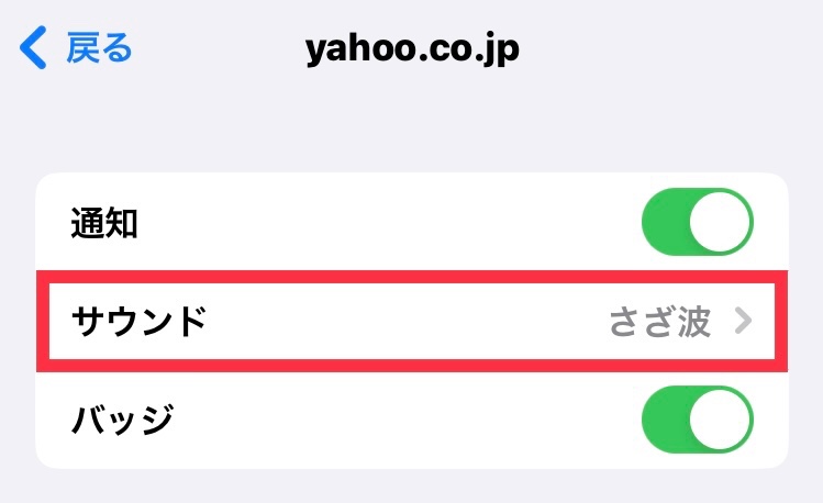 メールapp内の受信BOXがあるにも関わらず上記項目に「サウンド」が表示されていない時は、「通知」をオンにすると「サウンド」が表示されるようになります。