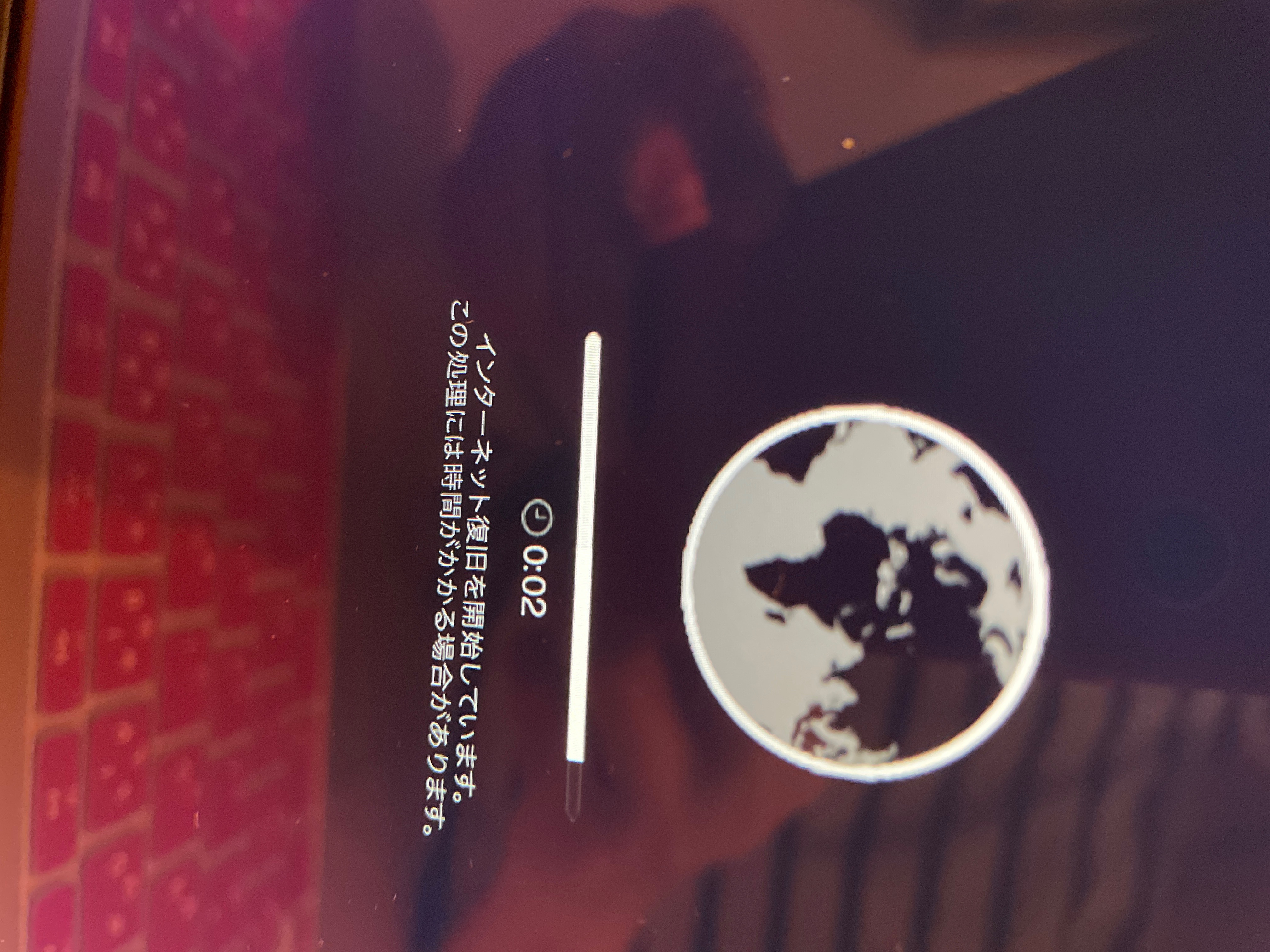 そうしたら地球がぐるぐる回るマークになり、インターネット復旧を開始しています という場面になりました(一度ここまで行き着いたのですが、、その後地球に射線が入るマークになりました。今は2回目をトライ中です)