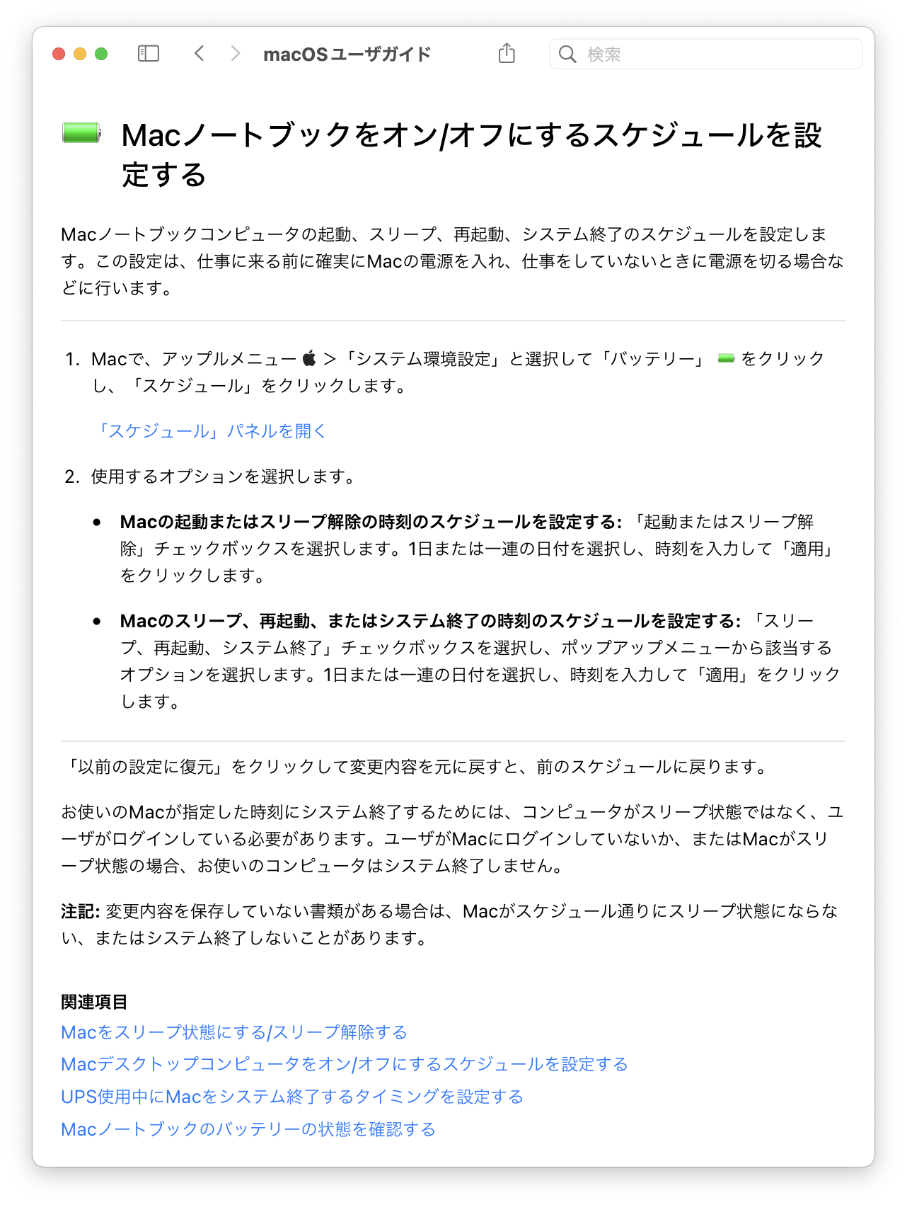 1. ウェブブラウザで「Schedule your Mac to turn on or off in Terminal - Apple Support」を開く