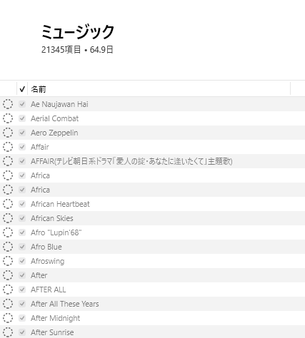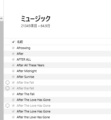 「同期」ボタンを押すと、「△の!」で1曲表示されますが、それ以外にも100曲ぐらい、同期されない楽曲に、点線の丸印がつきます。
