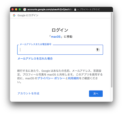 インターネットアカウントのウィンドウ左下の + ボタンをクリックし、右側の一覧からGoogleを選ぶと、 「Googleアカウントを追加するには、Webブラウザで認証を完了する必要があります」とのメッセージが表示されます。