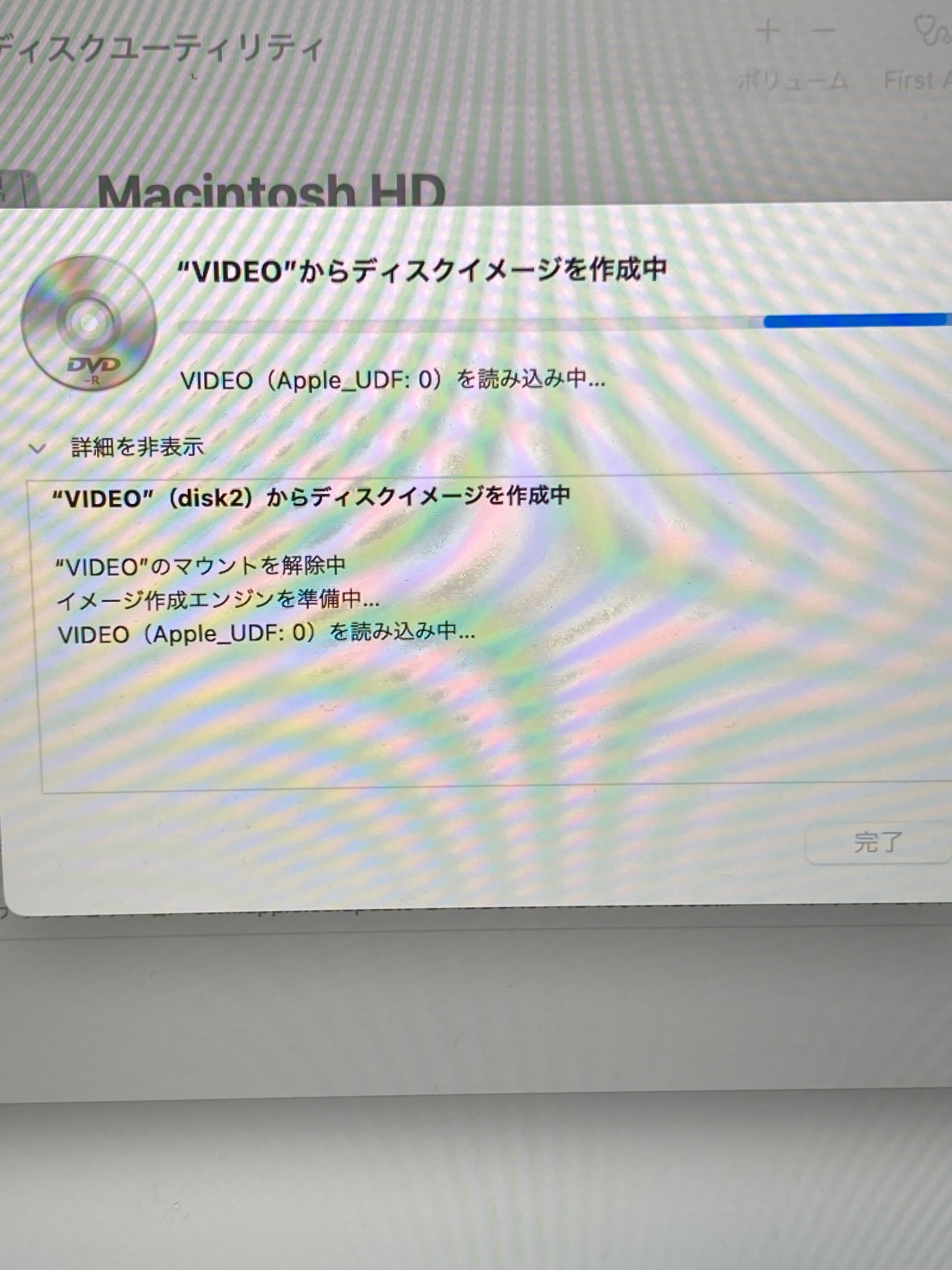 DVD(コピーガードなし)を複製しようと思い、ディスクユーティリティからディスクイメージ作成を行っていますが、5時間ほど経っても画面がずっと同じ表示のままです。