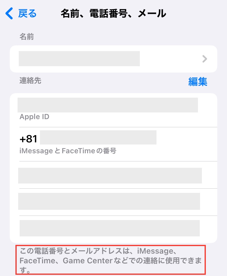 まず、設定>ユーザ名( Apple ID、iCloud、メディアと購入 )>名前、電話番号、メール>連絡先にApple IDと電話番号どちらも表示されていることを確認。