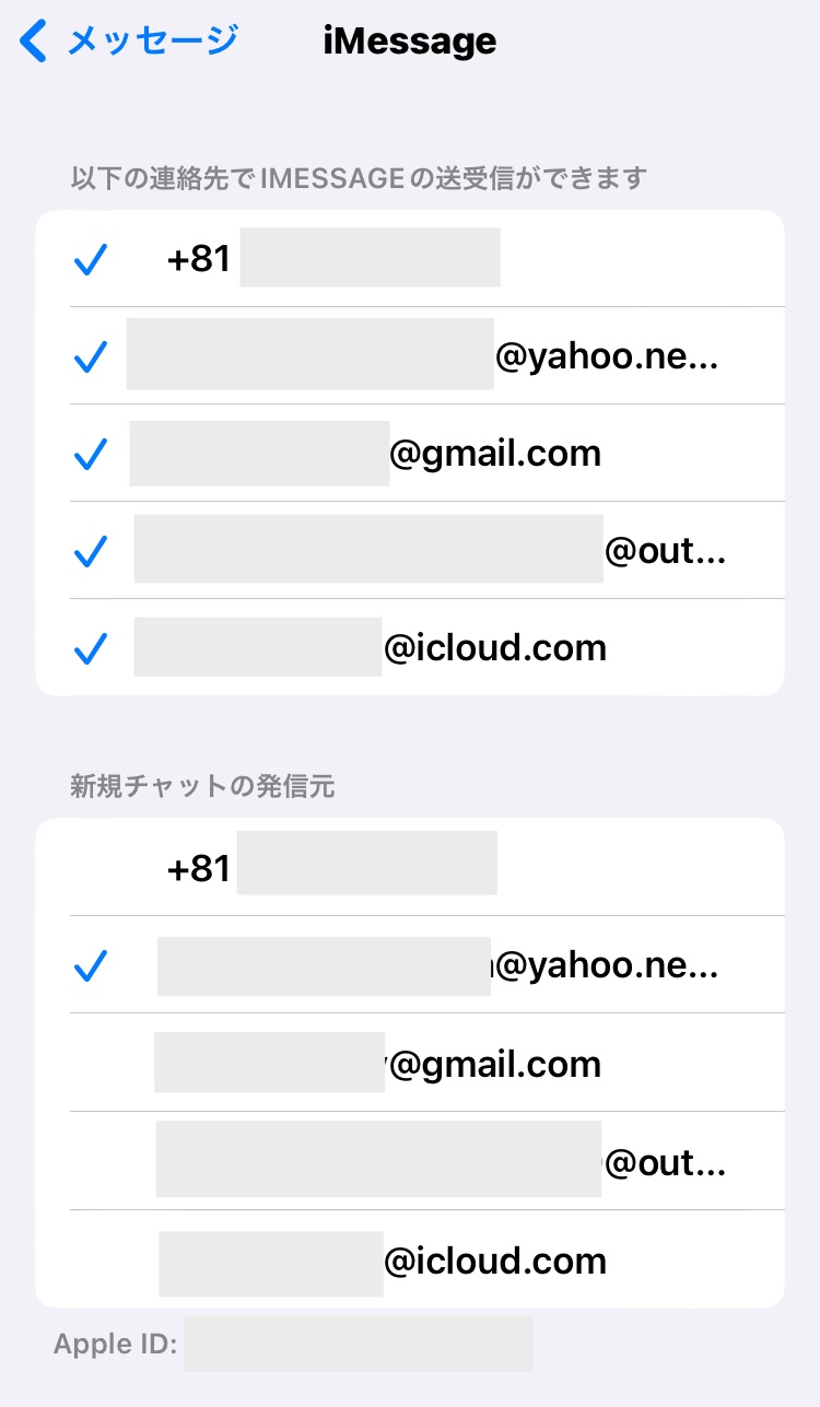 その後、設定>メッセージ>送受信>「新規チャットの発信元」でApple IDをタップして左端にチェックを入れるのはどうでしょうか?