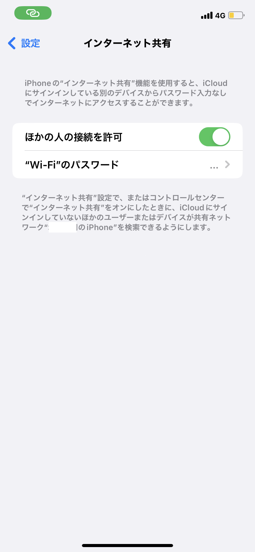 iPhoneの「インターネット共有>ほかの人の接続を許可:ON」として、端末側で当該端末を選択して「接続」としても、添付のiPhoneの画面左上にある「接続状況」が、何度か接続状況を示す緑の表示が付いたり消えたりを繰り返して、結局接続失敗で終わる。