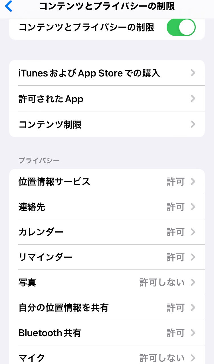 設定>スクリーンタイム>コンテンツとプライバシーの制限>マイク>「変更を許可しない」を「変更を許可」に変更し、さらにその下の各appも「オフ」になっていたら「オン」にして下さい。