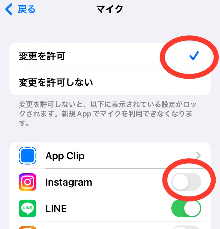 Instagramなどのアプリで写真、マイクのアクセス許可が出来ない
