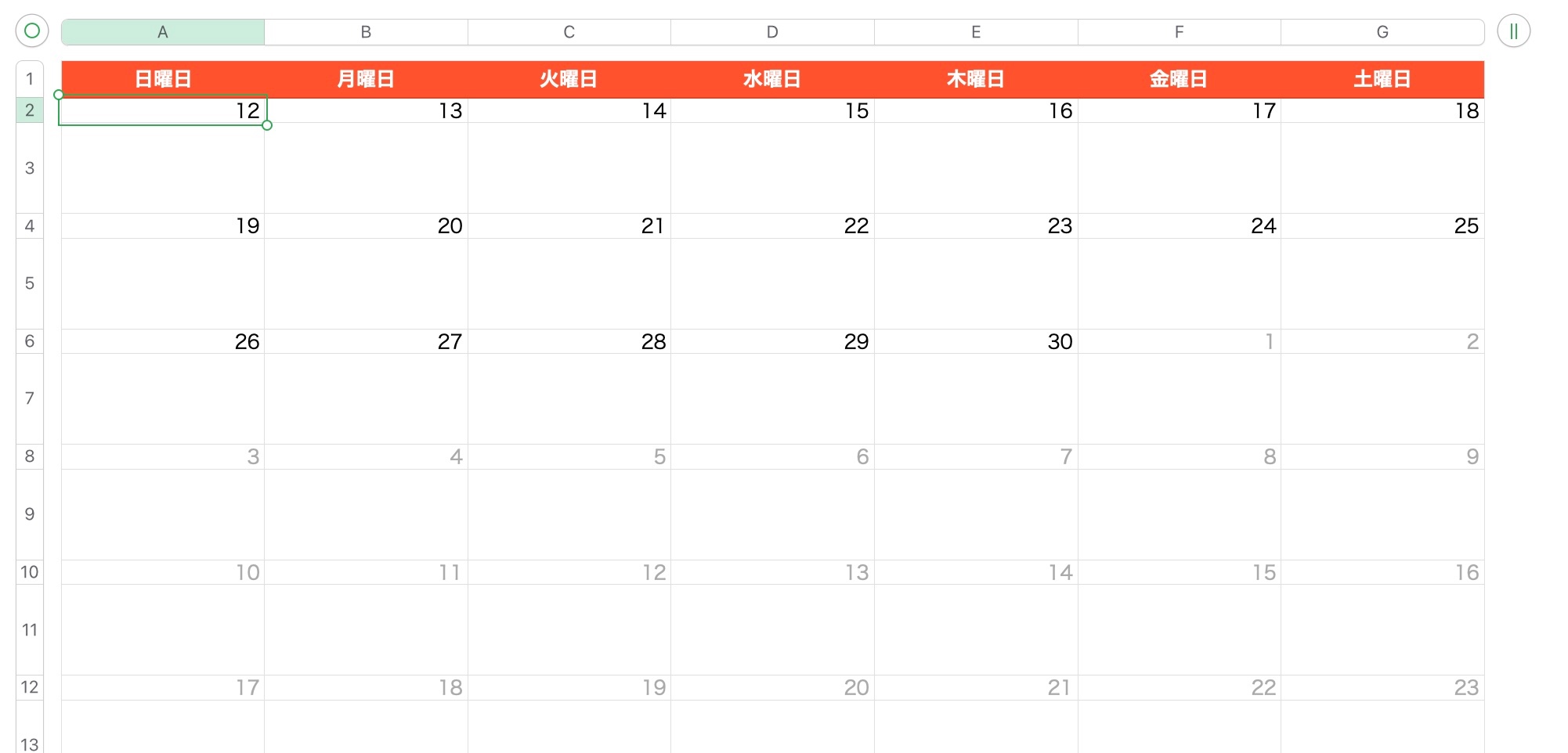 日付が薄いグレーの箇所は条件付きハイライトをお好きに書き換えてください。