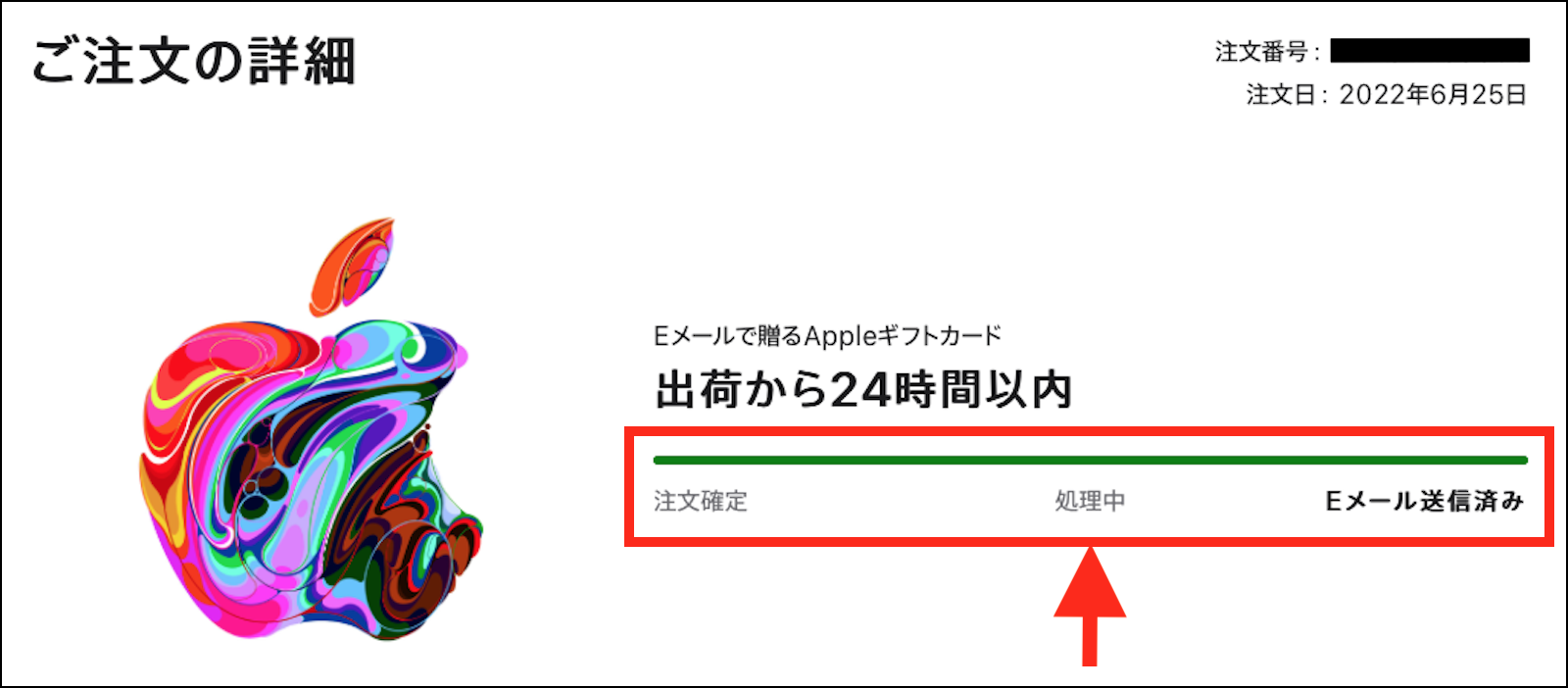 E メールで贈る Apple ギフトカードを購入した場合、以下の様な順番でメールが届きますが、「ご注文の確認」メールは届いているが、「ご注文ありがとうございます」メールが届いていない と言う状態でしょうか?