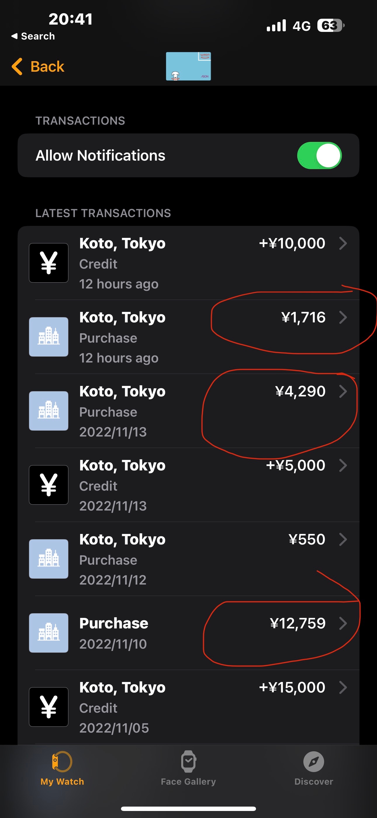 Some money gone from Apple Watch wallet WAON card without any purchase