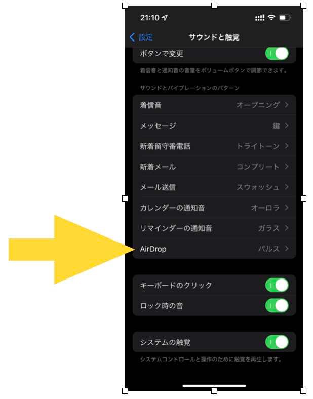 airdropのサウンドを変更したいのですが『サウンドと触覚』の設定にairdropがありません。