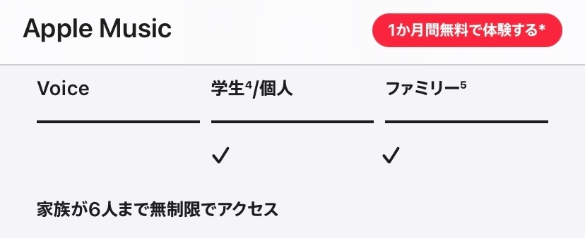 「Apple Music のサブスクリプションにファミリープランで登録すると、最大 6 人の家族がそれぞれのデバイスで Apple Music を制限なく好きなだけ楽しめます。」