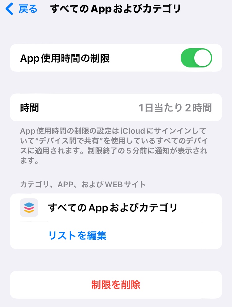 子供のiPhoneのスクリーンタイムを「すべてのアプリで2時間」と設定してもそれ以上使えてしまっています。