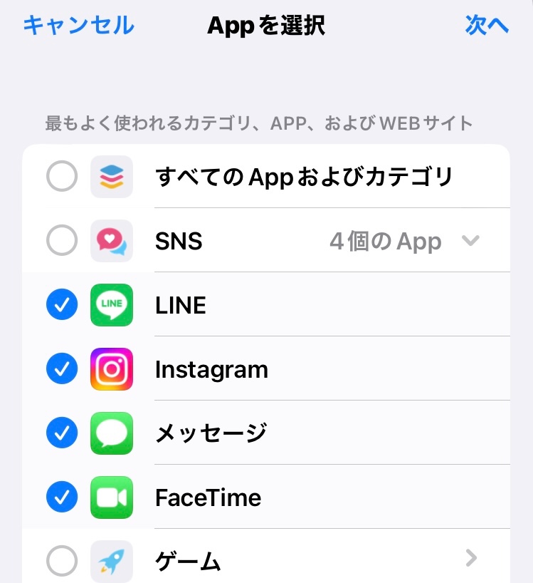 ②その下にある各カテゴリ(SNSやゲーム等)をタップすると右端の「>」が「∨」に変わり、appのアイコンが表示されるので、各appごとにチェックを入れていきます。