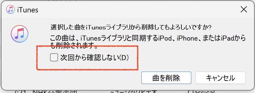 また、削除するときに下記ダイアログが表示されるのですが、「次回から表示しない」をチェックしてしまうと以後は確認なしに削除されます。