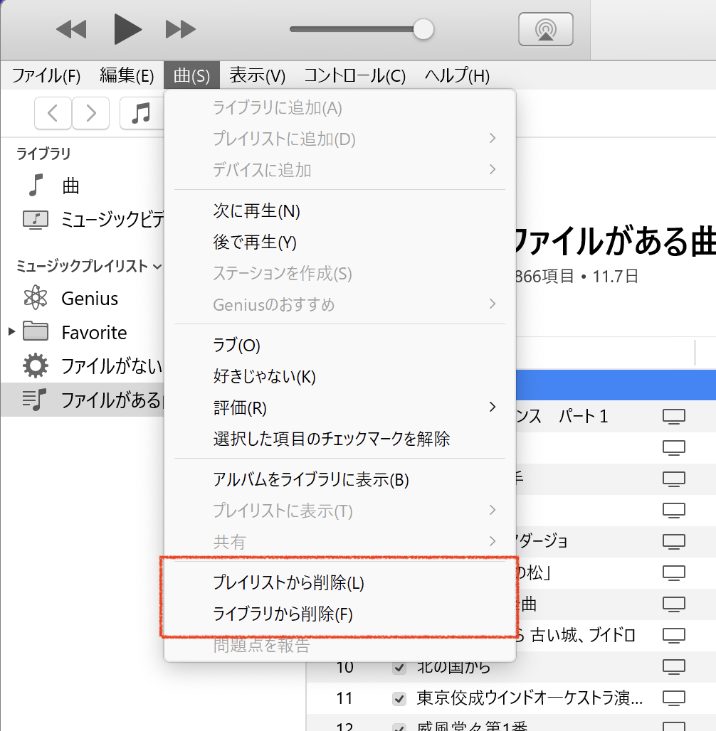 メニューには「プレイリストから削除」と「ライブラリから削除」が並んで表示されますので、この選択を間違えば曲データがなくなります。