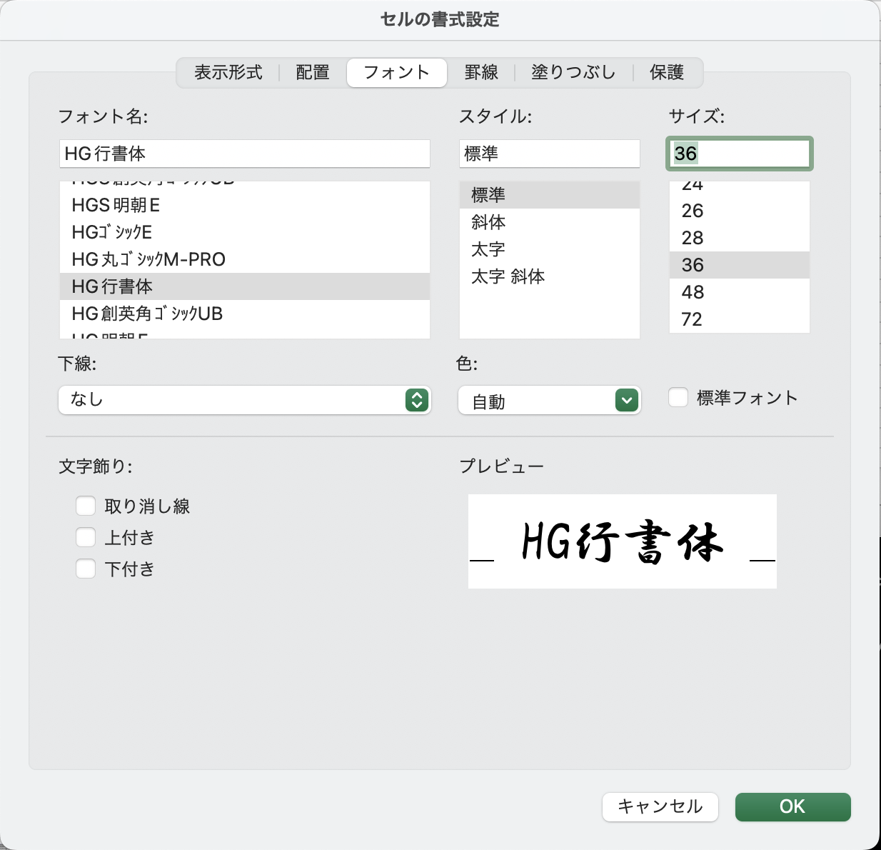 CSSで {font-size:36pt; font-family:'HG行書体';}