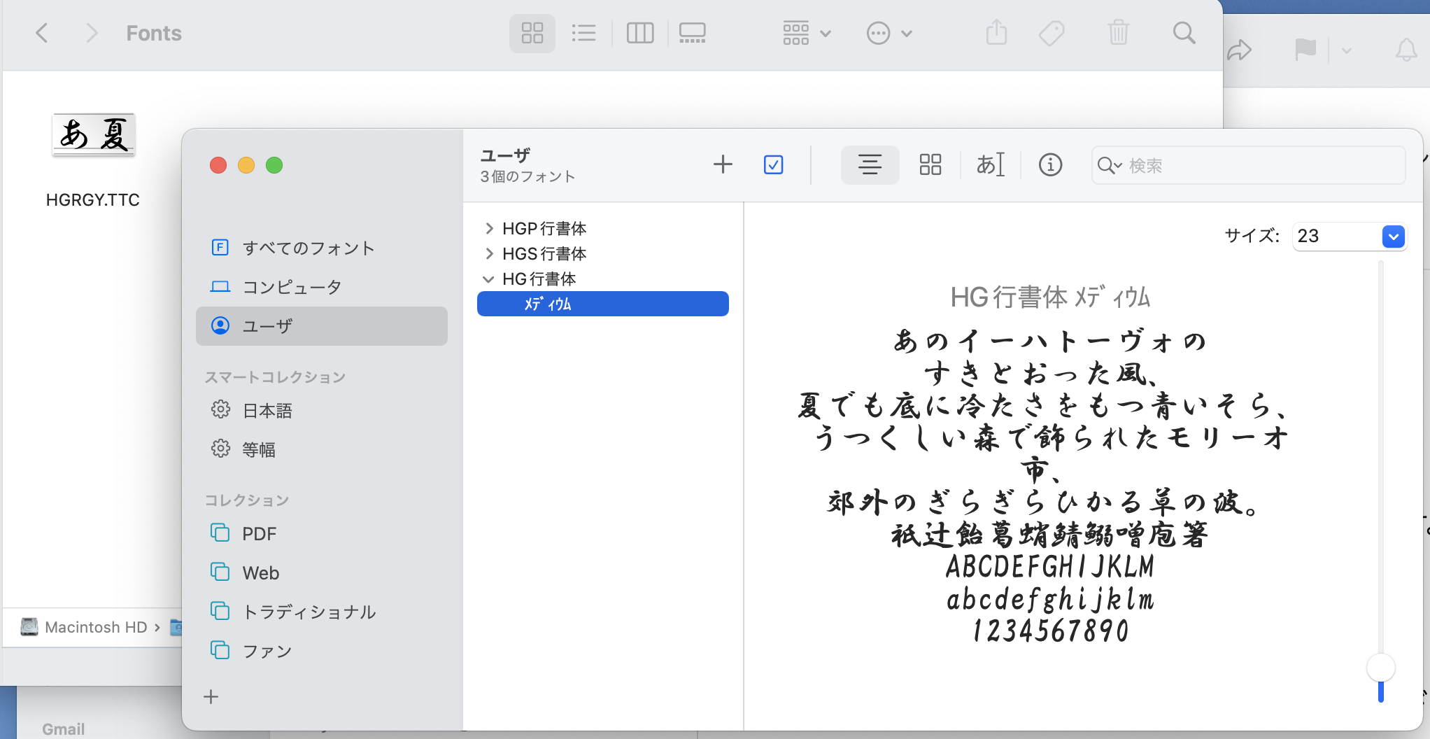 「 HGRGY.TTC」を /ユーザ/user名/ライブラリ/fonts にインストールして、