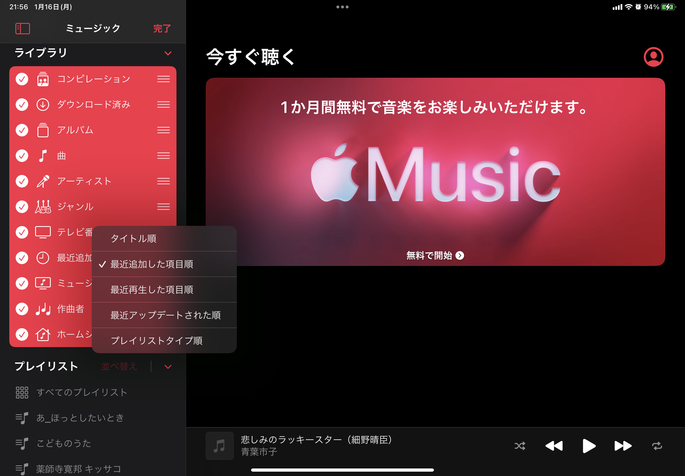 iPad のミュージックのプレイリストを数字→英文→カナ→漢字順に変えたい