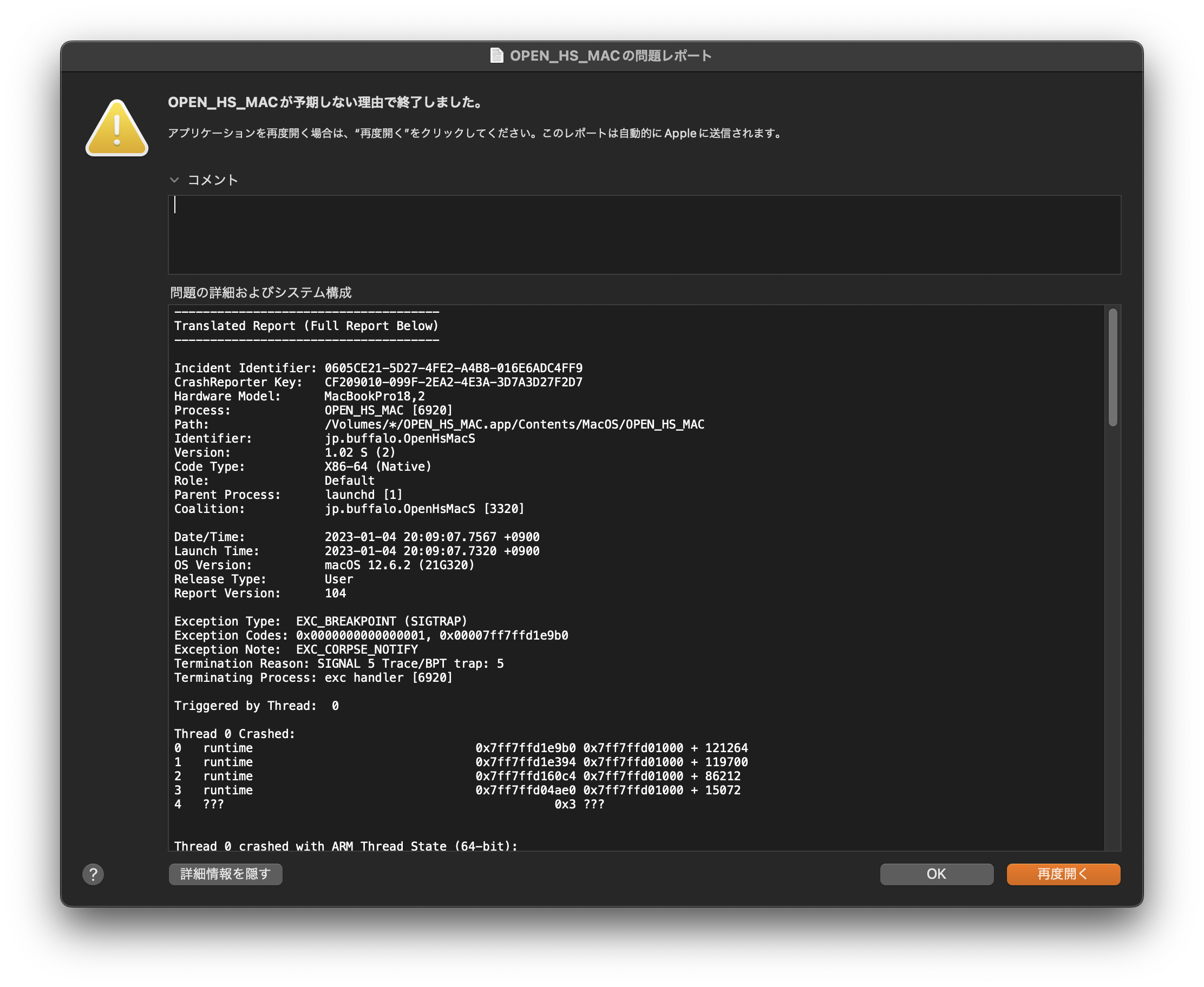 OPEN_HS_MACなどのソフトが予期せぬエラーで起動できません