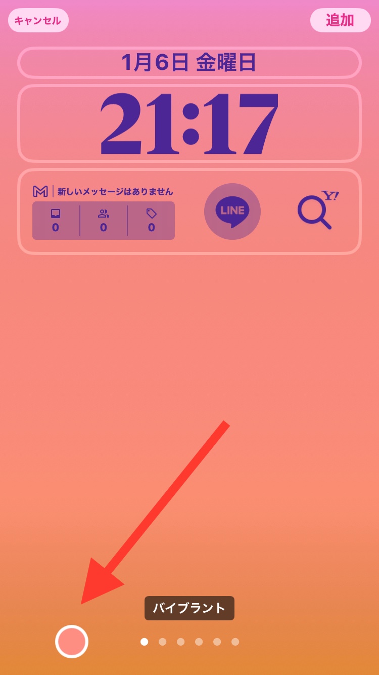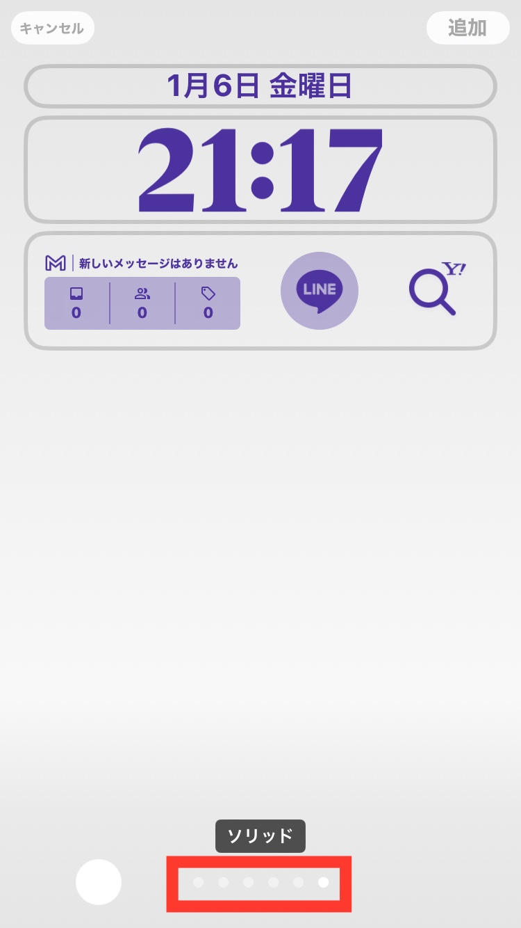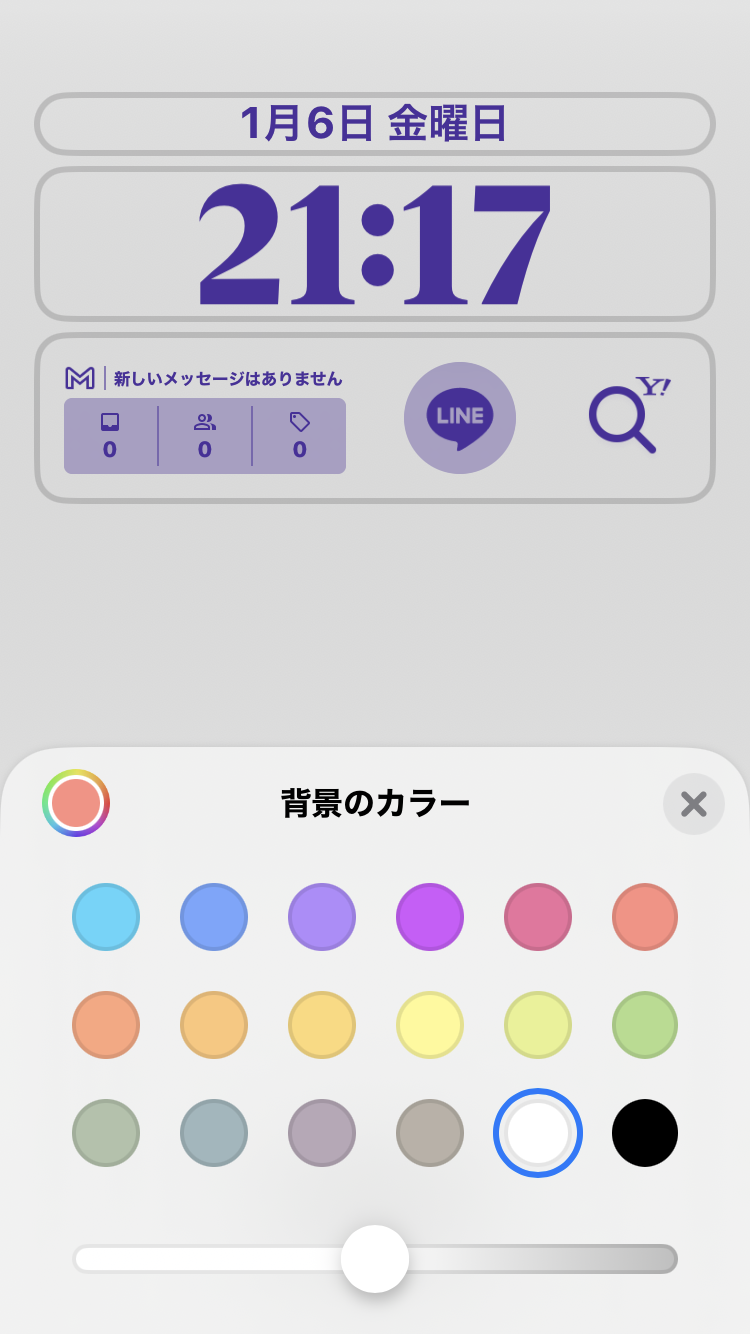 画面左下の○をタップ>背景のカラー:白色を選択>画面一番下⬜︎の箇所を左右にスライドし、 はバイブラント 〜 ソリッド の中から好みのものを選択