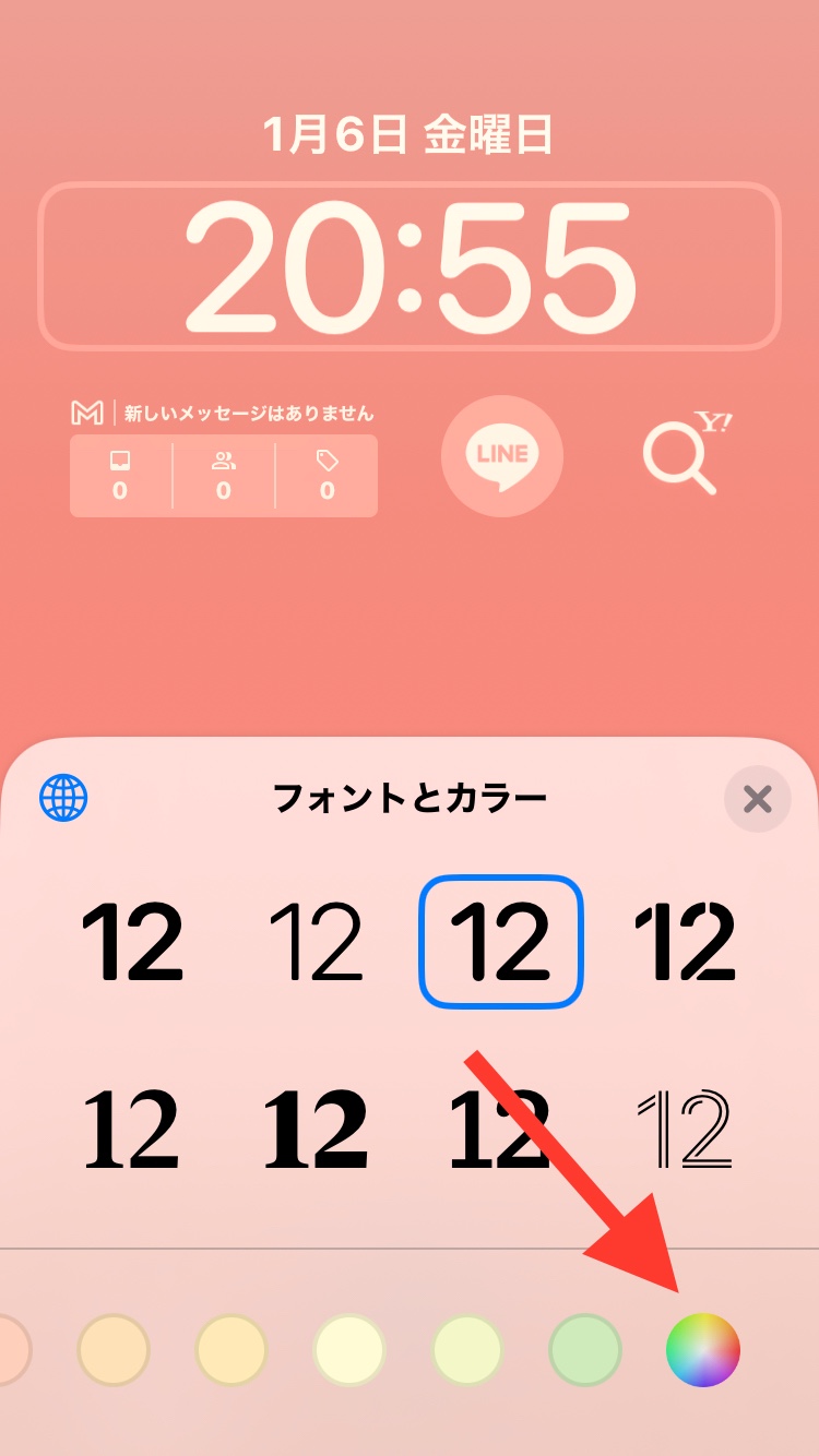 設定>壁紙>+新しい壁紙を追加>おすすめ:カラーをタップ>時刻をタップ>フォントとカラー:○の箇所を左にスライドし一番右端の虹色の○をタップ>カラー:お好みの色を選択
