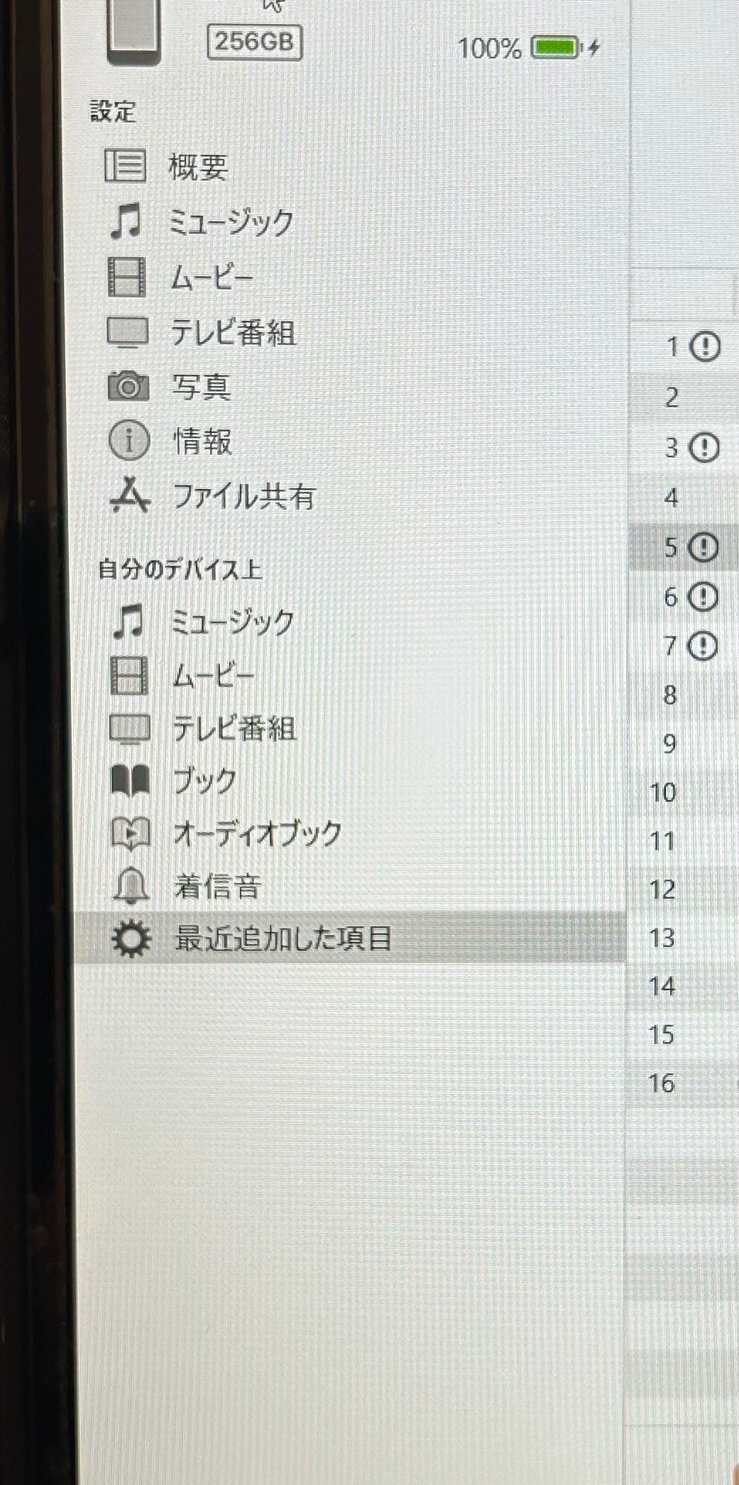 iTunesで曲が聞けるのにiPhoneに表示されません。このビックリマークはどうすれば消えますか?