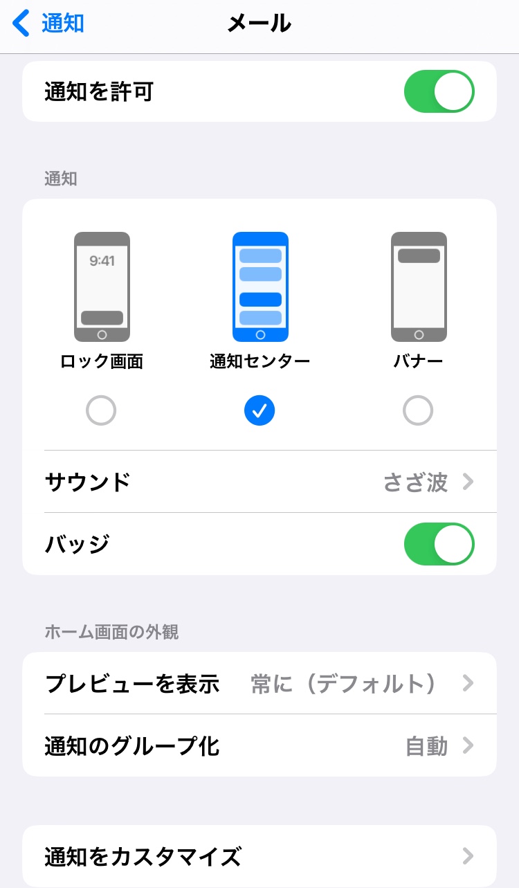 設定>通知>メールでも同じように「バナースタイル」が表示されないのでしょうか。