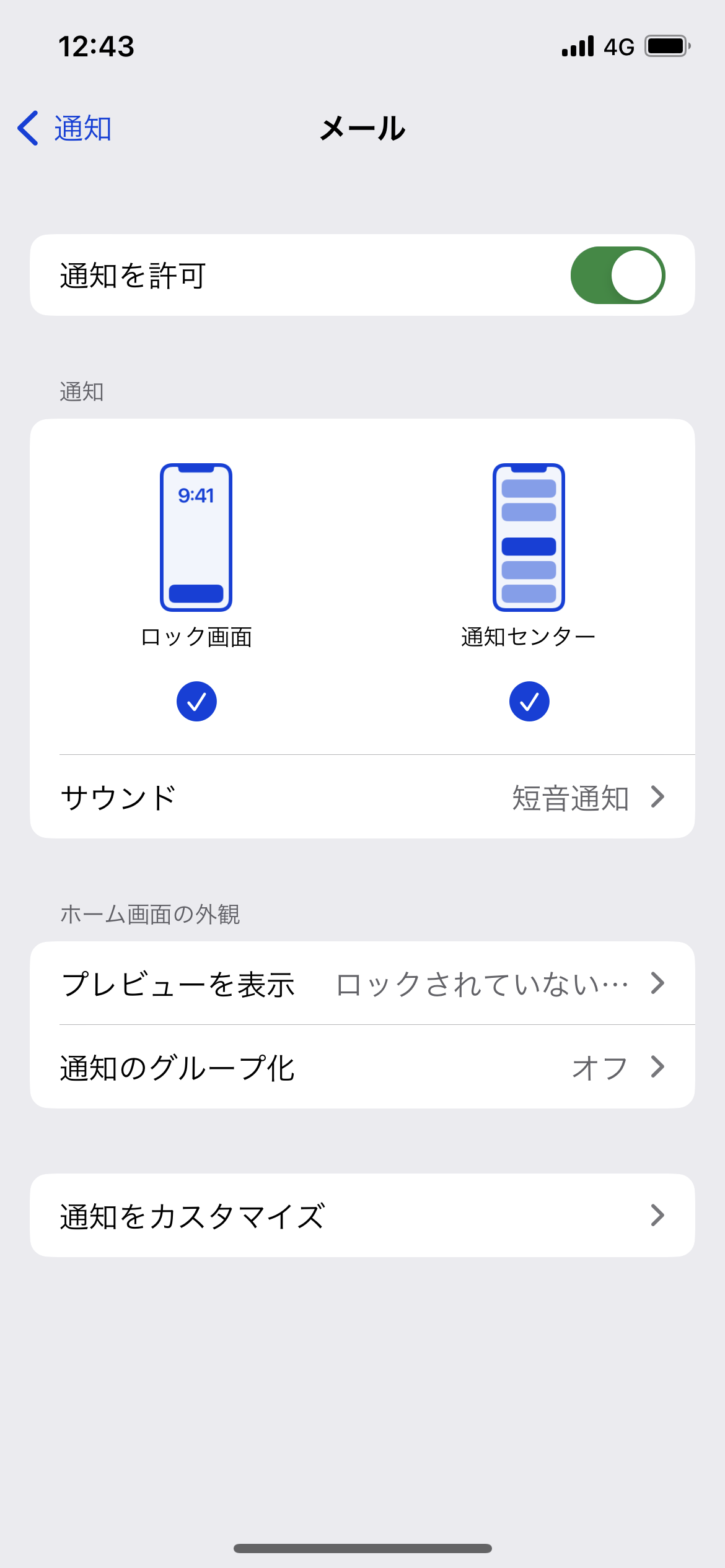 設定>通知>メール>通知をカスタマイズ>iCloud と進めていくとこのような画面になります。