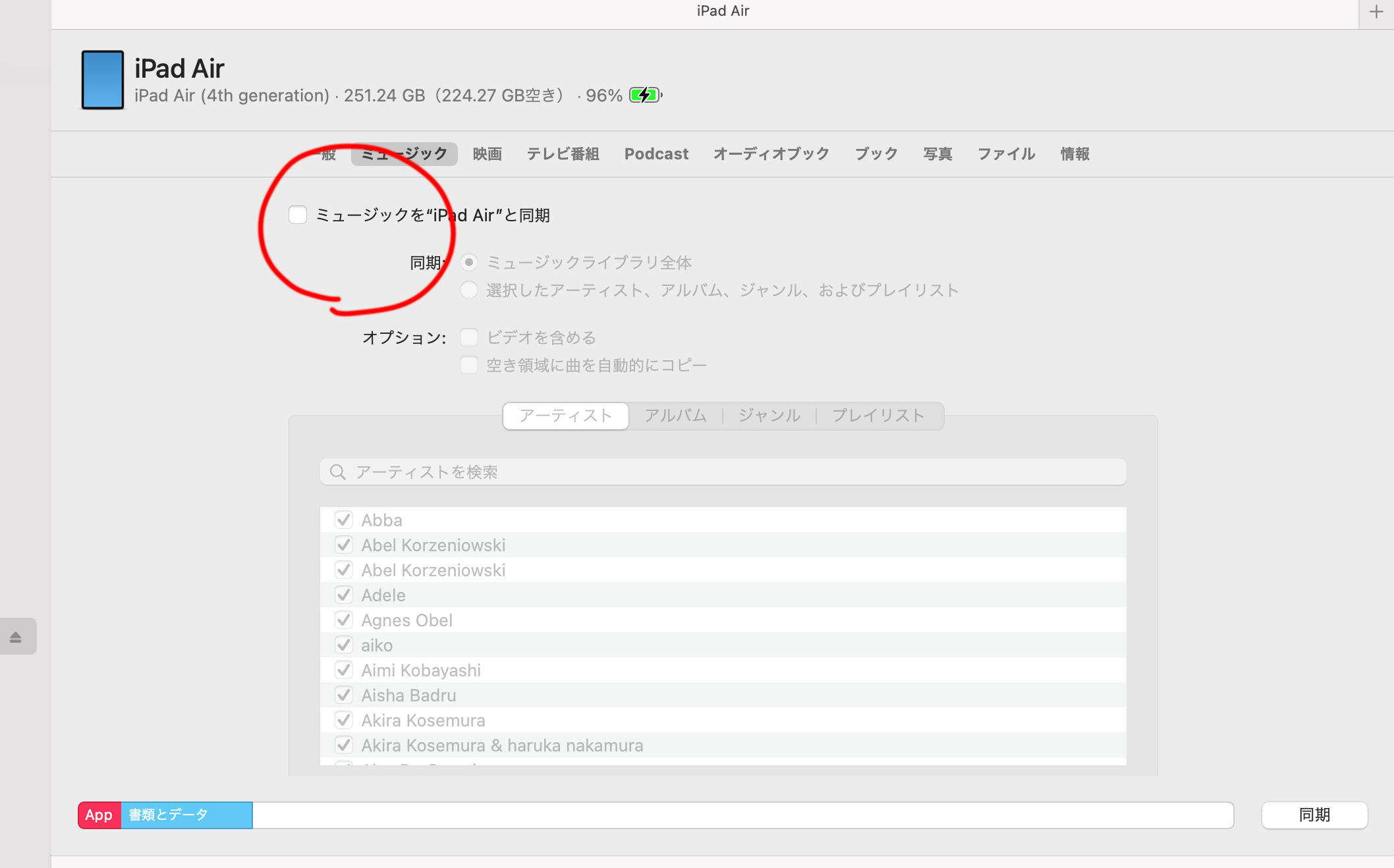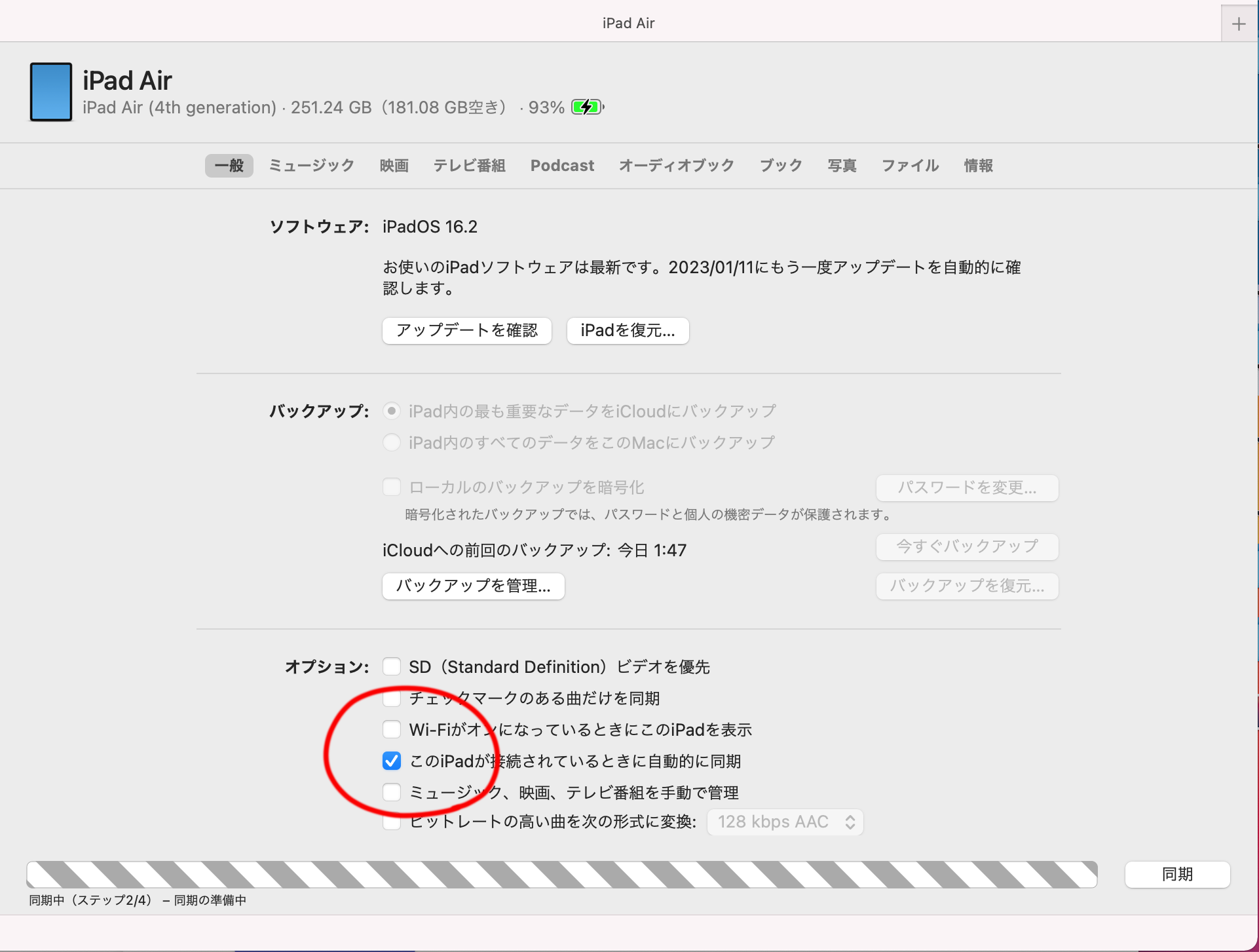 ・予め「このiPadが接続されているときに自動的に同期」のチェックを外しておき、次の日に同じ様にしてつなぐと