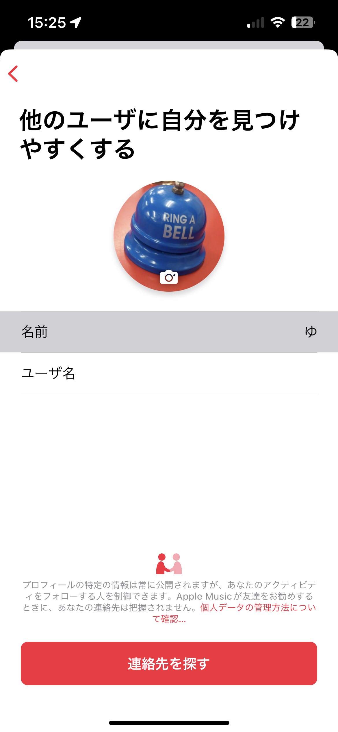 for you → アカウント → 友達が聴いている音楽をチェックする→ 今すぐ始めよう→ から名前とユーザー名が入力できる画面に移るのですが、ユーザー名が入力できない状態で【連絡先を探す】に進むことができません。またユーザー名も設定できません。