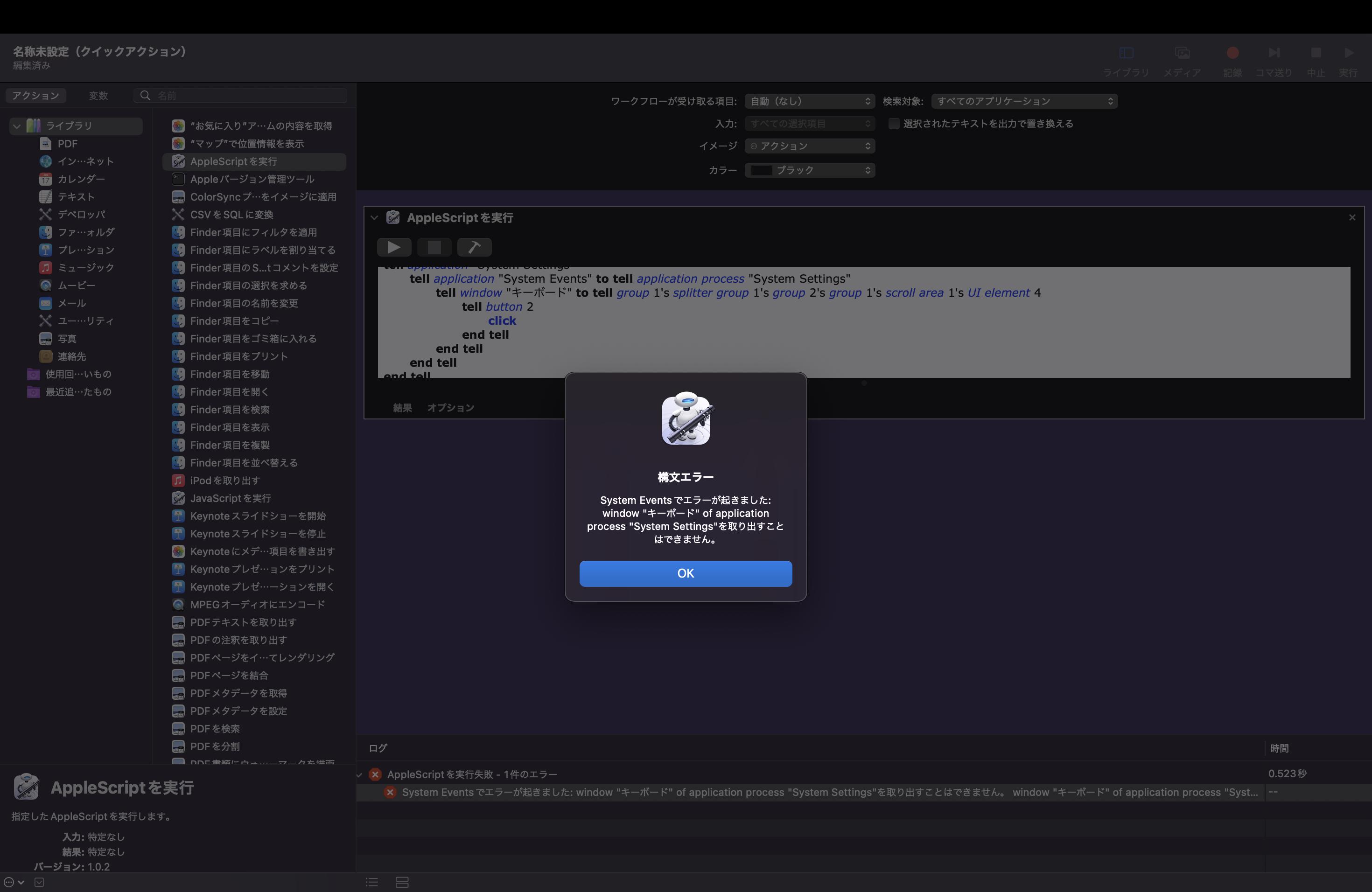 AutomatorでのSystem Settingsエラー