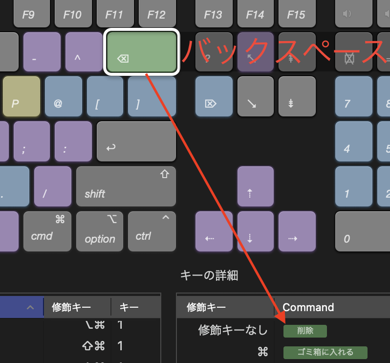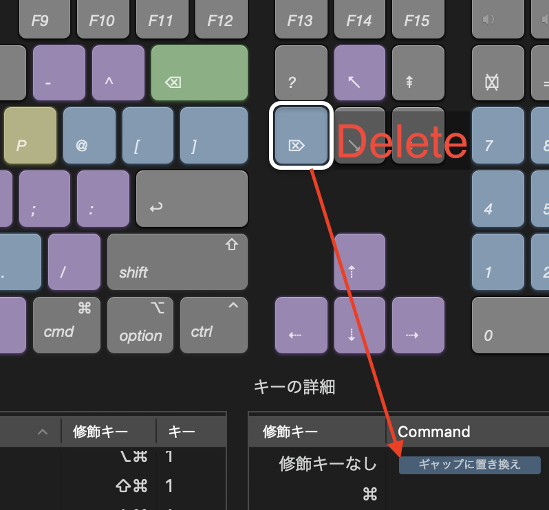 Deleteキーですか?という質問を思い返していて気づいたことがあり、自己解決しました。