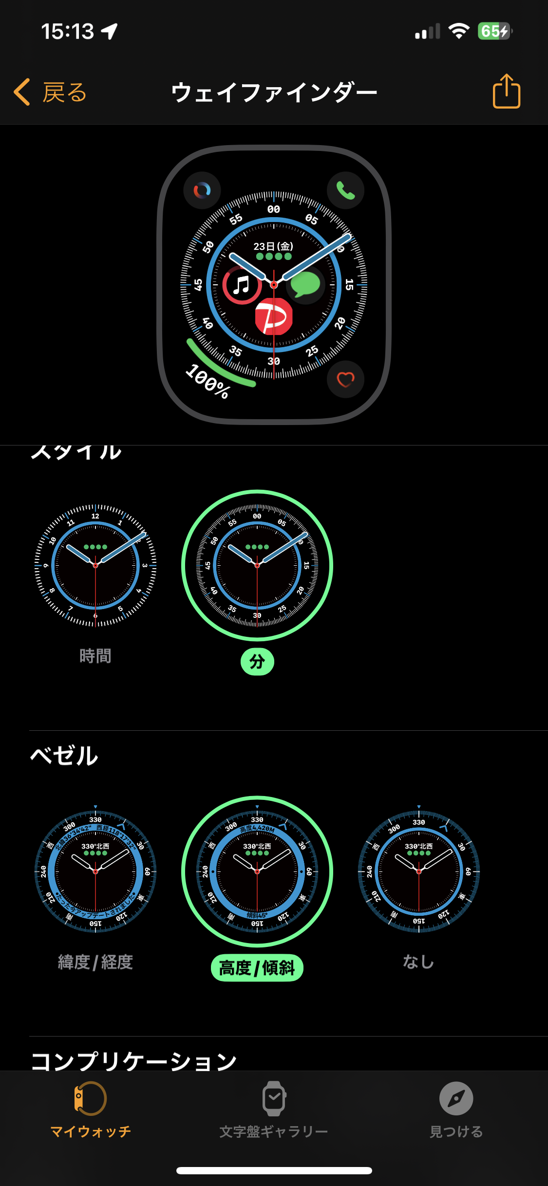 デフォルトでは、「ウェイファインダー」文字盤でベゼル(分や時間を表示するリング)をタップすると、ベゼルがコンパスになり、現在の緯度と経度の座標がリング内に表示されます。代わりに高度/傾斜を表示するには、文字盤をタッチして押さえたままにし、「編集」タップして、左にスワイプして「ベゼル」画面を表示して、Digital Crownを上に回してから、「高度/傾斜」を選択します。