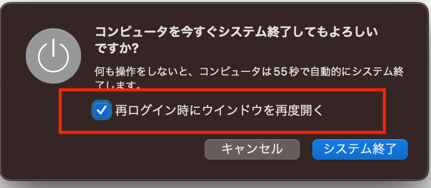 再起動、システム終了時の「再ログイン時に再度ウィンドウを開く」のチェックも外しています。