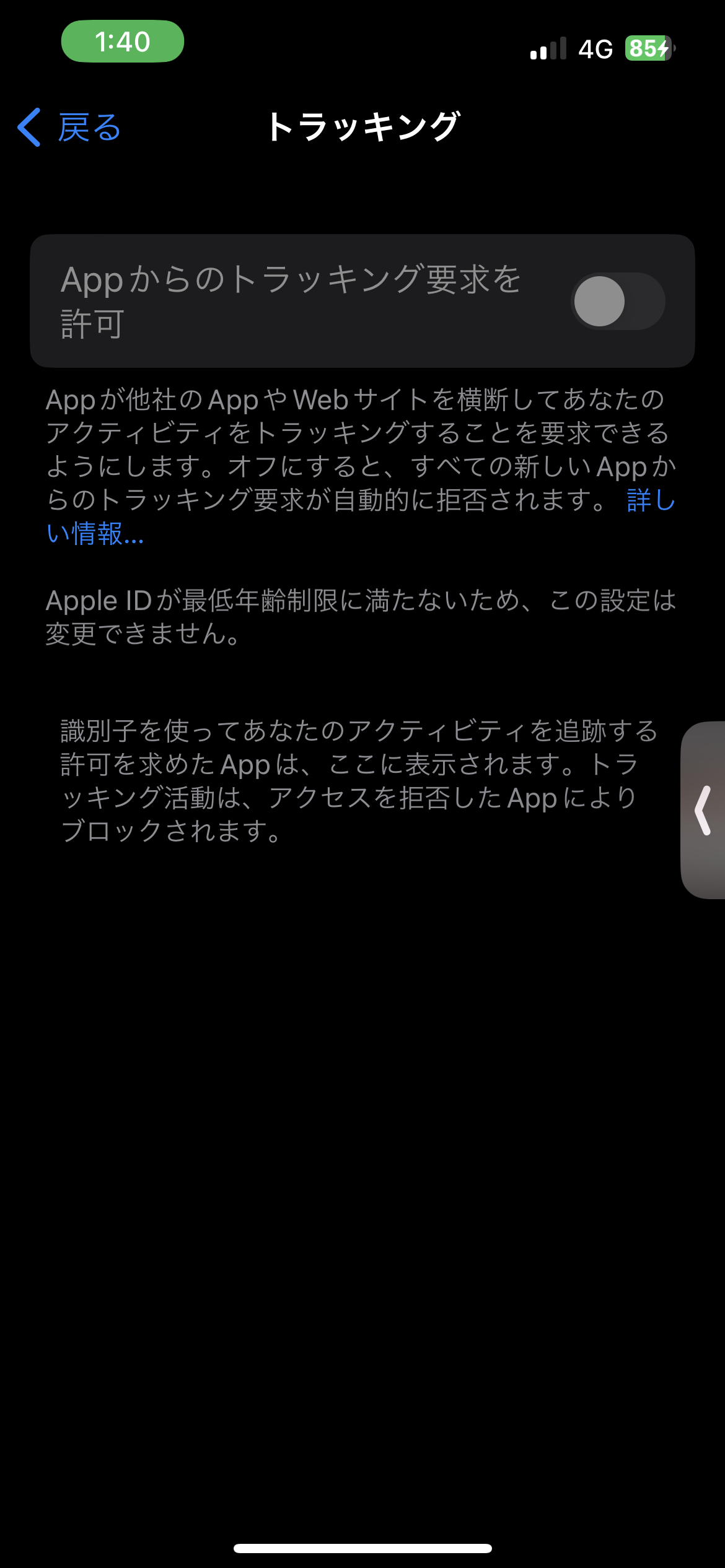 ”App からのトラッキング要求を許可”と”パーソナライズされた広告” がグレーアウトしている