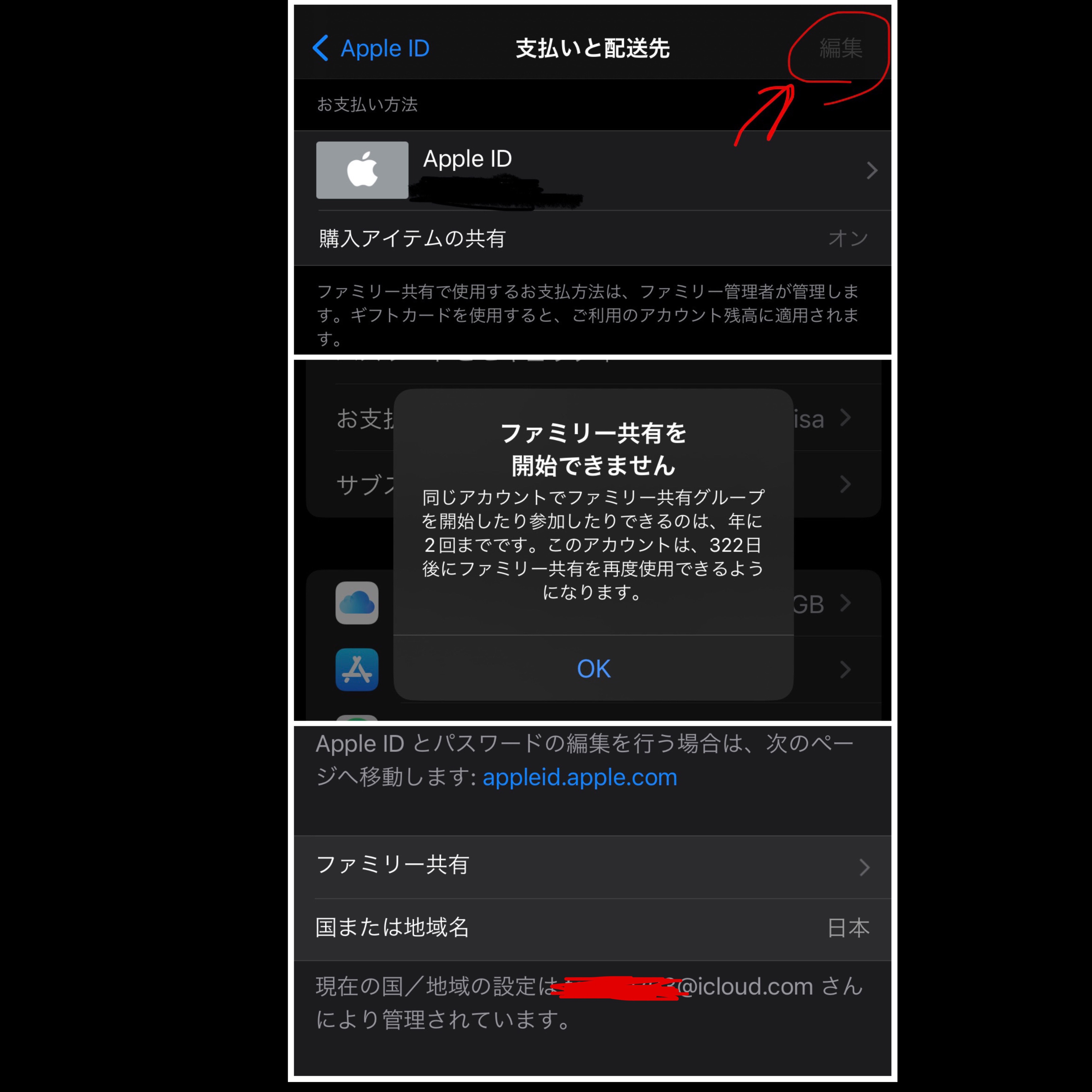 ファミリー共有を停止し決済方法を変えたいが、編集ボタンがタップ出来ない