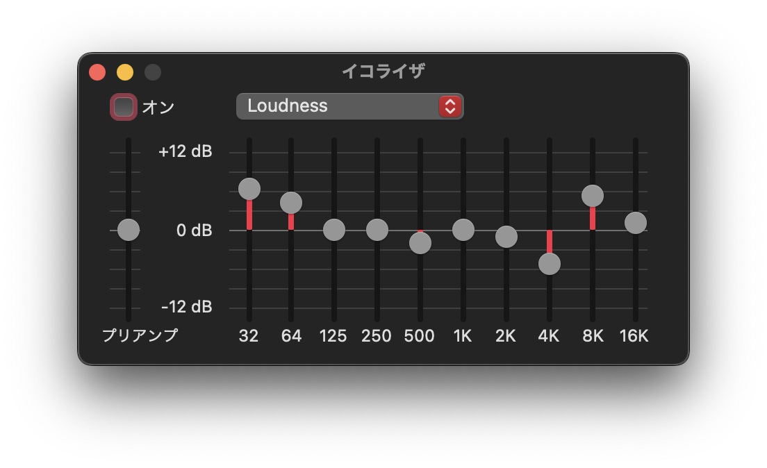 このウインドウは「イコライザ」画面なので「⌘ + option + E」で表示できます。