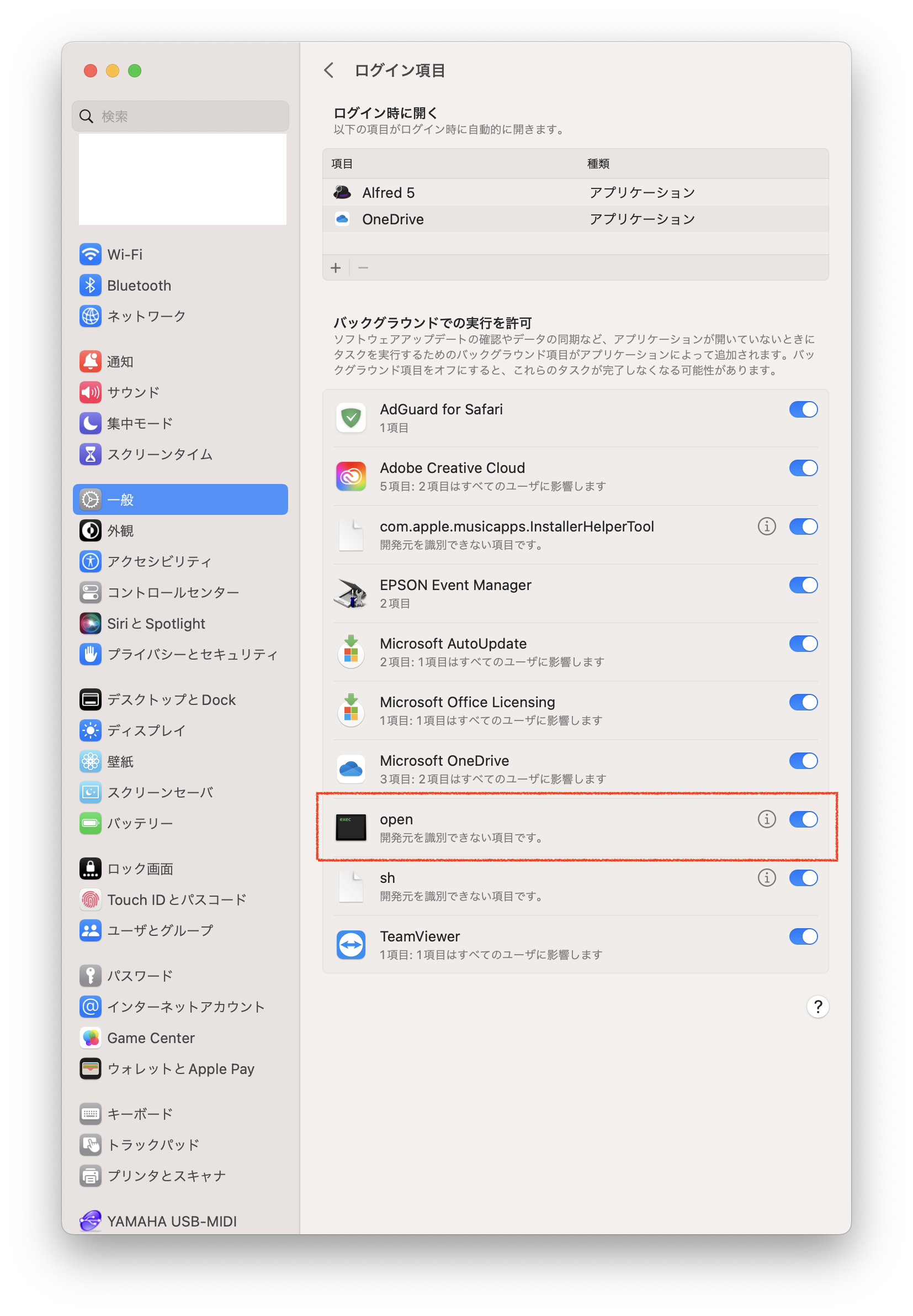 macOS 13.2.1 - ログイン項目に表示される「open」がバックグラウンドでの実行を許可「ON」で表示されるが問題ないか