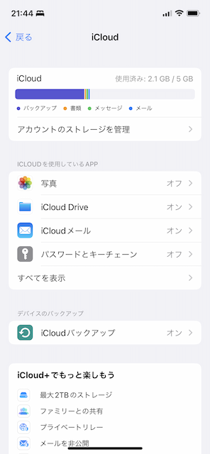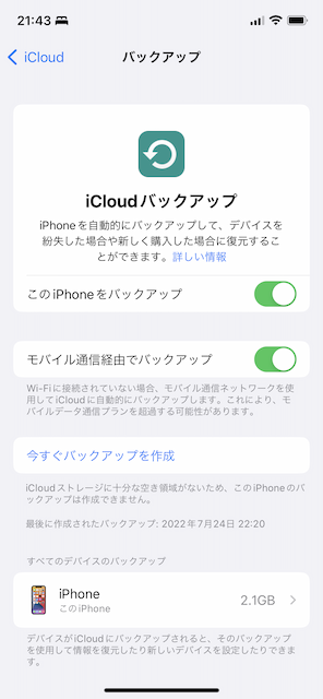 iCloudバックアップの画面にて最後のバックアップが2022/7/24と記載されているので、その後、バックアップしなかったのか、されなかったのか定かで無いですが、iCloudバックアップは過去2回分を持つと言いますので1回に2.1GB使っていたら足りない様な…。