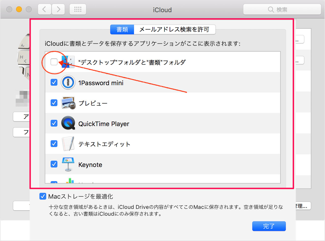 「システム環境設定>Apple ID>iCloud>iCloud Drive>オプション>”デスクトップ”フォルダと”書類”フォルダ」をオフにする。
