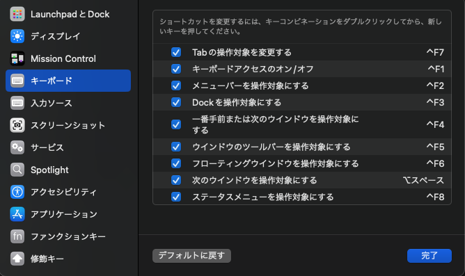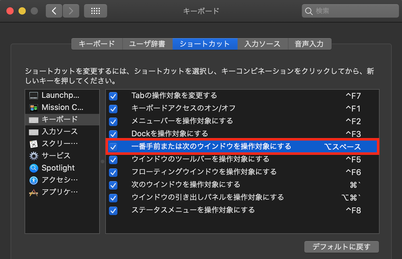 環境設定にてキーボードタグにある”次のウィンドウを操作対象にする”という操作にデフォルトで⌥+スペースキーが割り当てられているのですが以前は使用出来ていたのですがいつからか分かりませんが使用出来なくなりました。OSのアップデート以外は特に内部の構成は変更しておりません。アプリで影響がありそうな物はカラビナエレメントがありますが、以前は併用出来ていた気がしますしアプリをアンインストールしても変化なしでした。