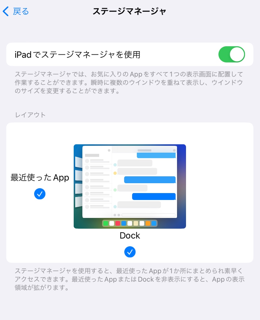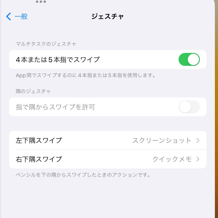 設定で、”iPadでステージマネージャを使用“をON に設定すると、“指で隅からスワイプを許可”は設定できなくなるようです。
