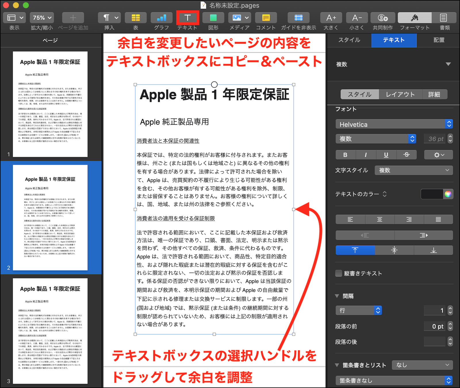 「書類設定」インスペクタの「書類」タブ >「書類の余白」で変更を行うと、書類全体の余白が変更されますので、テキストを直接入力されている場合は、以下の手順で操作 して見て下さい。