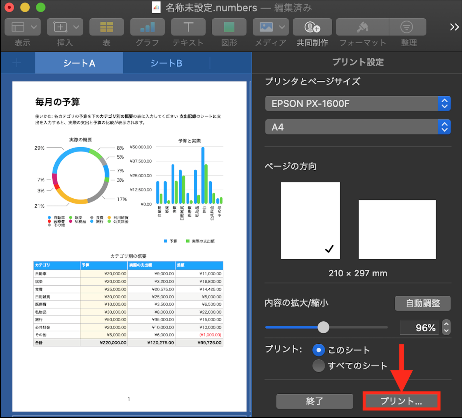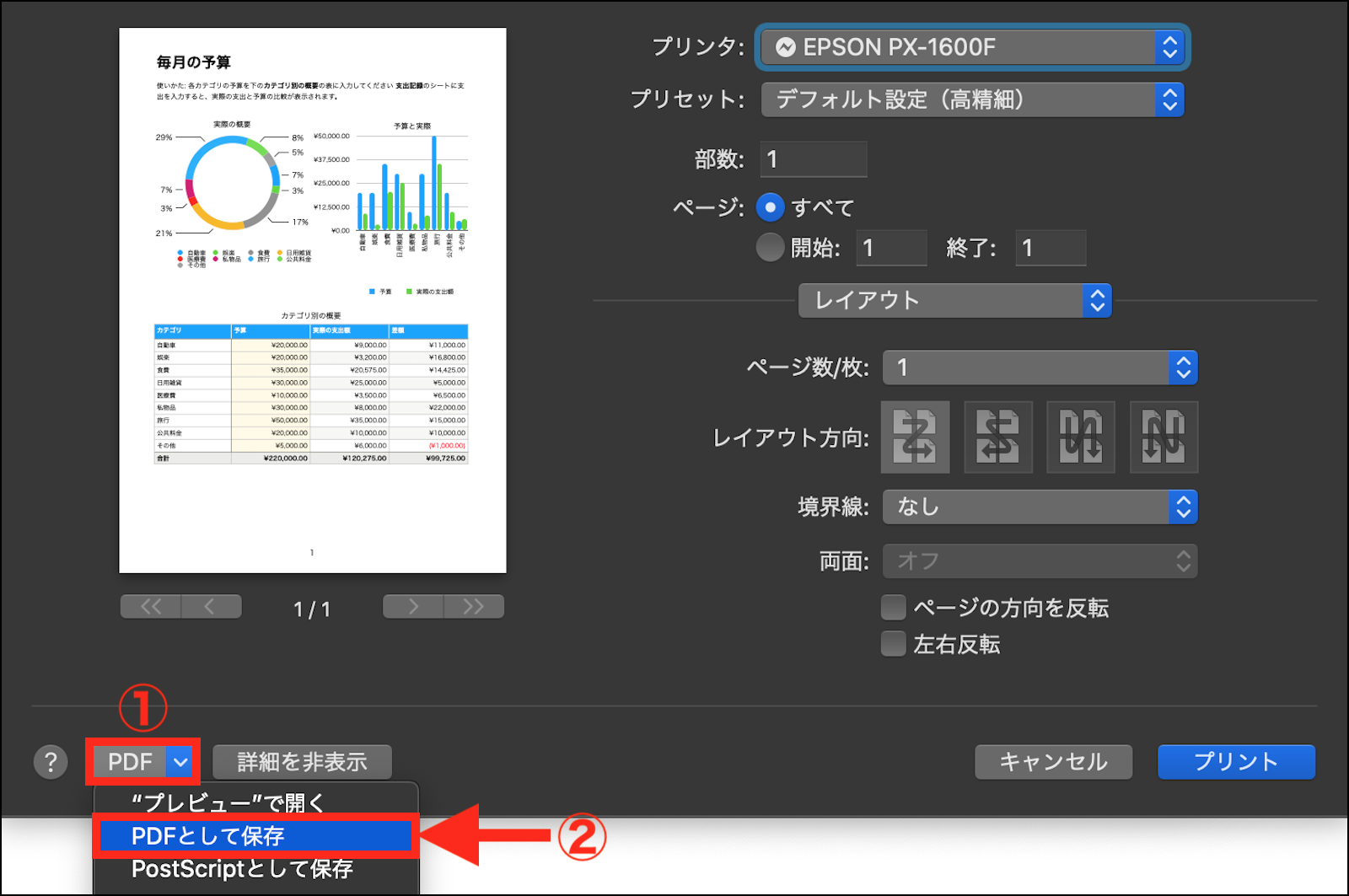 1. PDF として書き出すシートを選択し、「command」+「P」キーで「プリント設定」画面を表示させる。