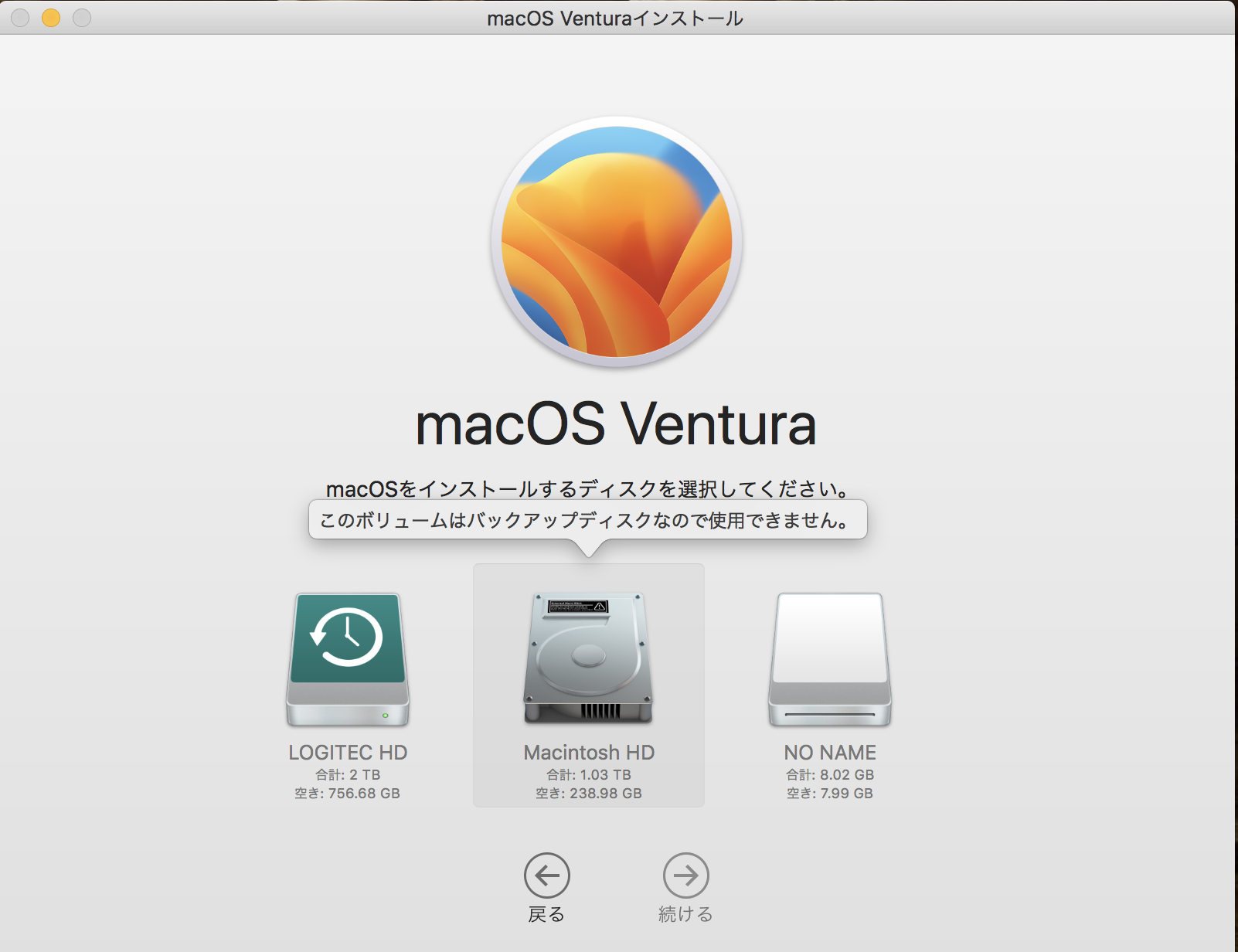 Macintosh HDが「バックアップディスクなので使用できません」と表示され
